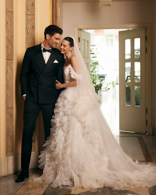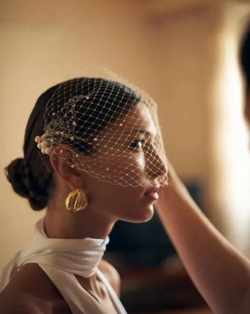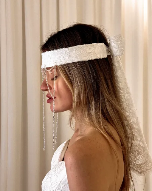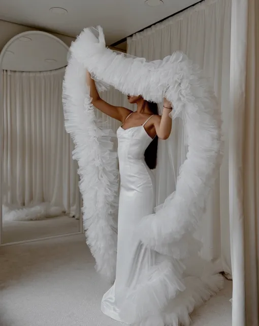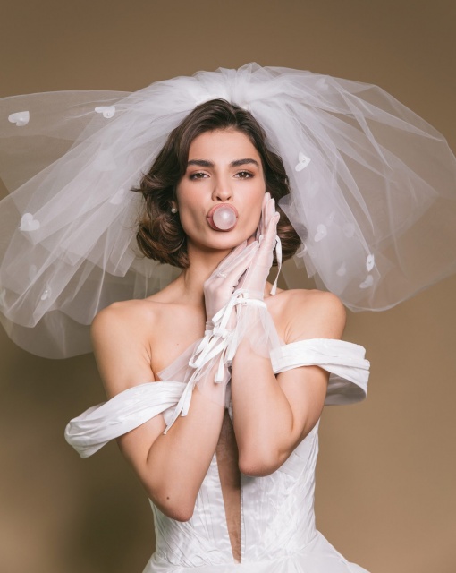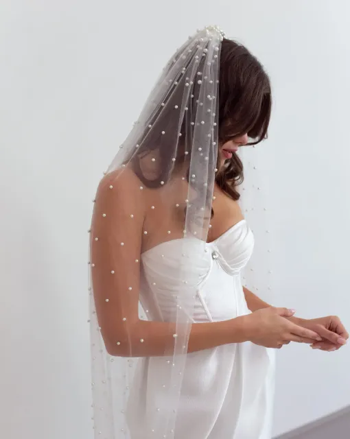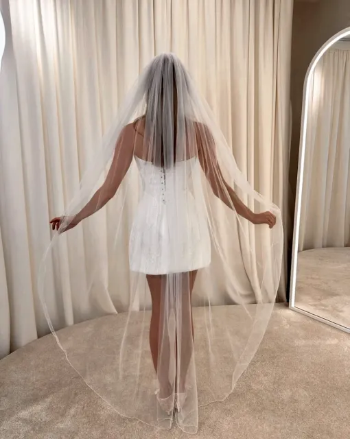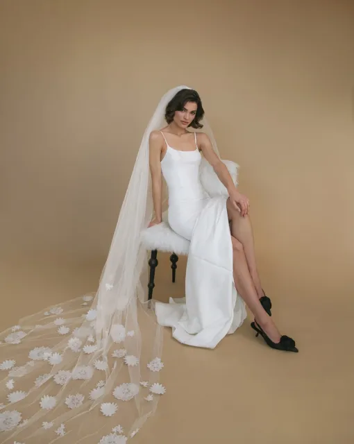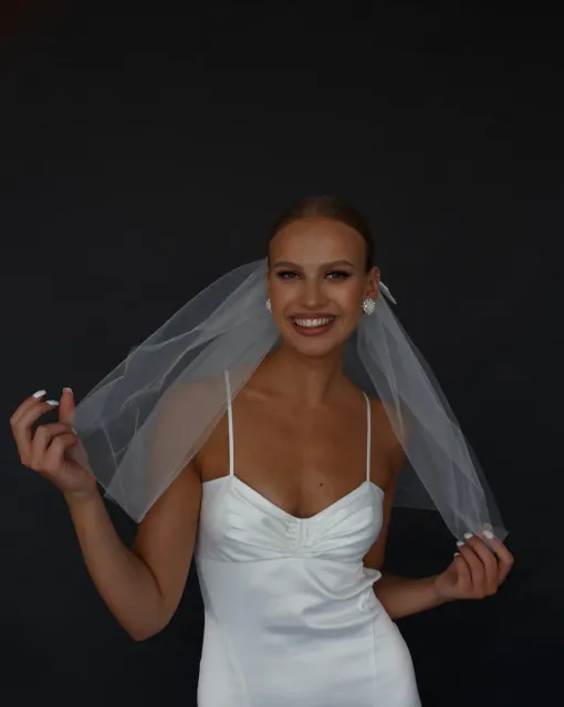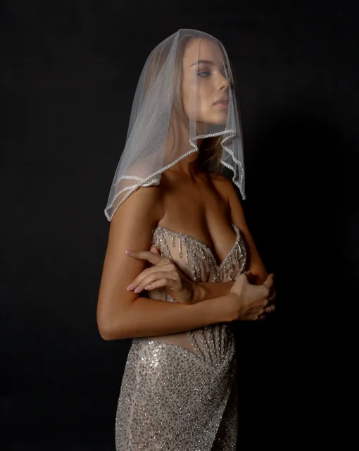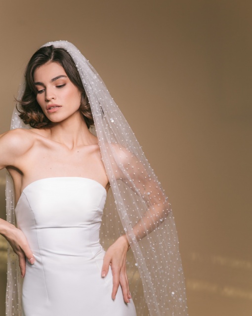 Длинная двухслойная фата со стразами по всей длине. Фата выполнена таким образом, чтобы невеста могла носить ее, полностью разложив по спинке или перебросив часть фаты на лицо.