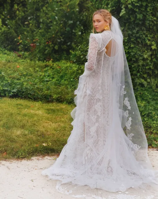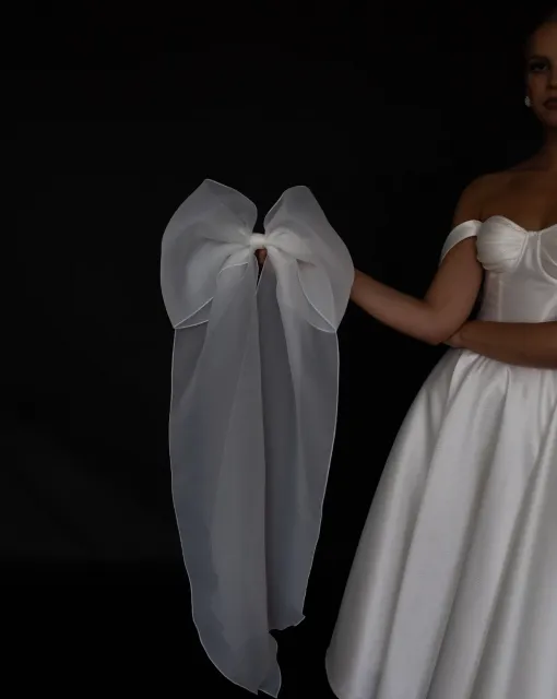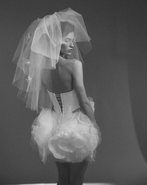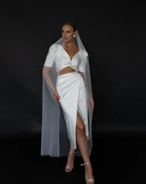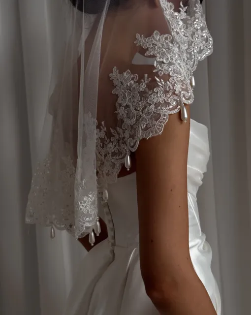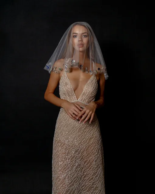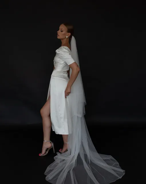 Длинная фата, которая может быть ярким акцентом образа невесты благодаря тому, что край фаты дополнен драпировкой. Драпировка по краю фаты придает ей дополнительный объем. Один из слоев фаты можно перебросить вперед и прикрыть лицо невесты.