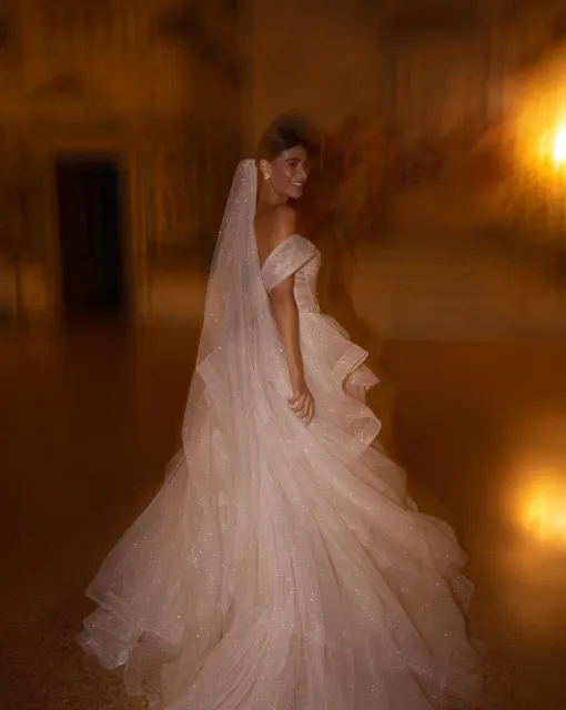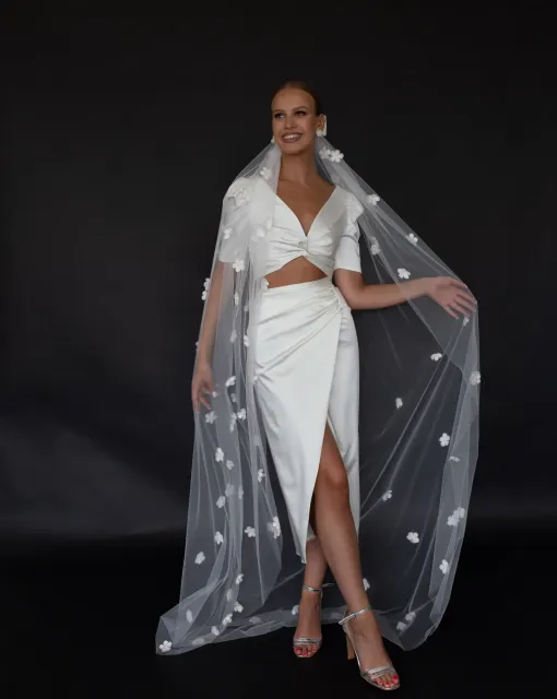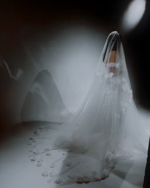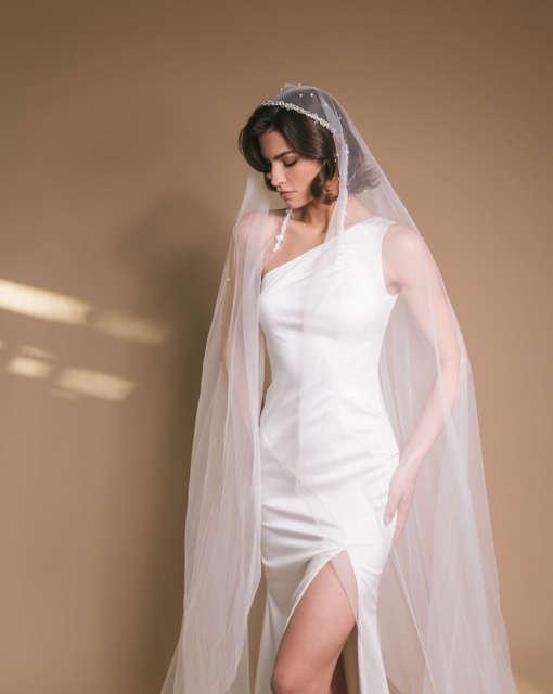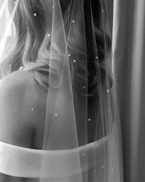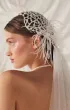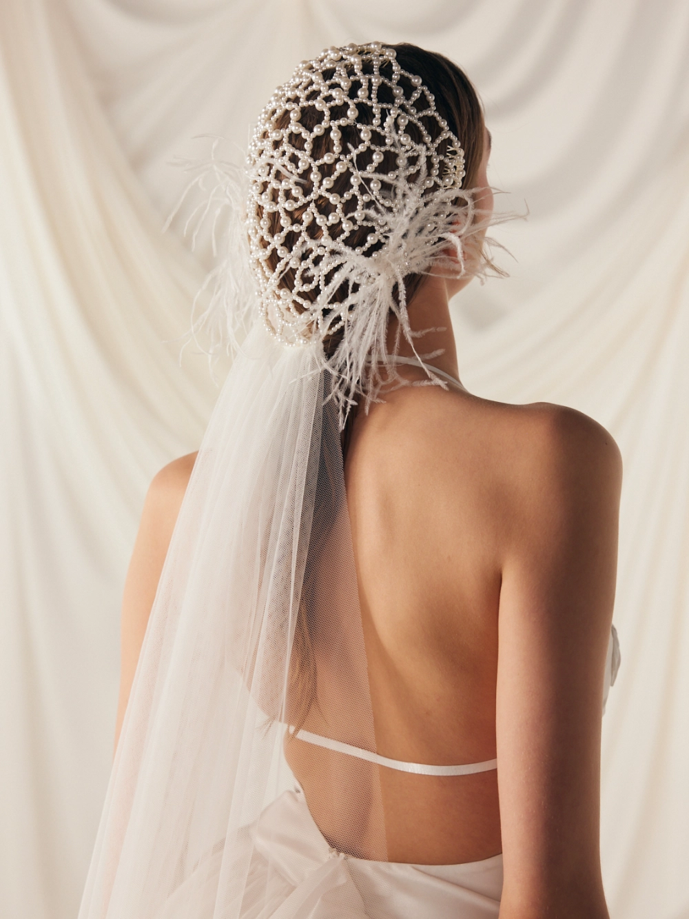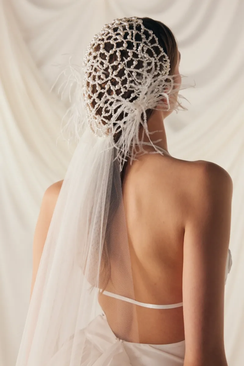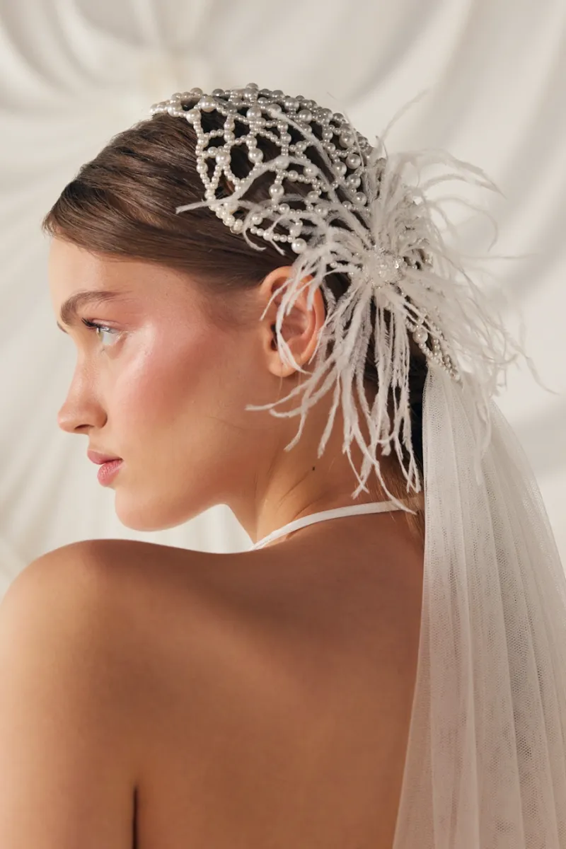 Фата с расшитой сеткой и перьями. Основание украшено крупной сеткой из жемчужных бусин, напоминающей корсетную вышивку или плетение кружева. В декоре — тонкие перья, добавляющие воздушности и кутюрного шика. Полотно фаты мягкое, средней длины, струится по спине и фиксируется на затылке. Такая модель особенно подчёркивает шею и линию плеч, а также подойдёт для стилизованных образов в духе ар-деко или fashion-драмы.