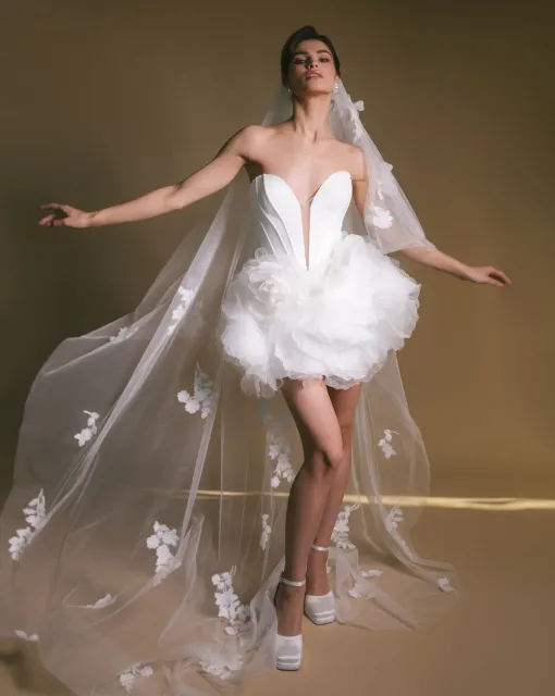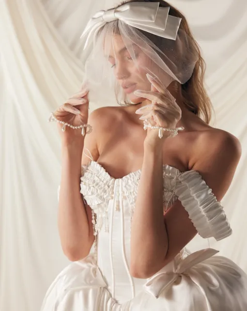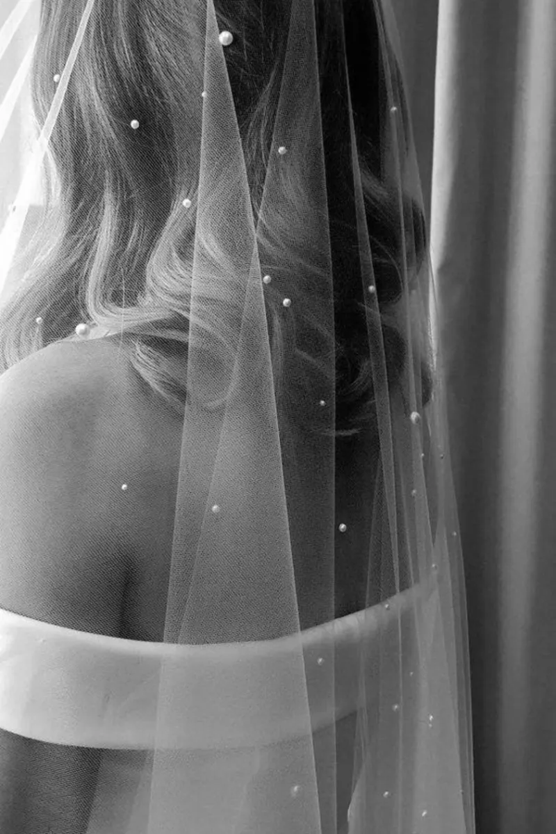 Фата с россыпью жемчужин. Минималистичная фата из невесомого тюля, усыпанная россыпью жемчужин, словно каплями росы. Лаконичная, но выразительная — она добавляет образу невесты утончённую игру света и благородный акцент без лишнего декора. Универсальна по стилю и идеально сочетается как с лаконичными платьями, так и с более романтичными силуэтами.