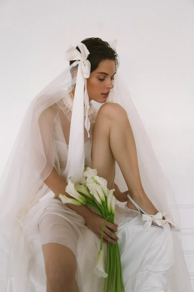 Фата с шелковыми лентами. Изысканная многослойная фата, украшенная широкими шелковыми лентами, завязанными в мягкие банты. Лёгкая, воздушная, с нотой богемной чувственности. Эта модель прекрасно дополняет как винтажные, так и минималистичные свадебные образы, придавая им индивидуальность и деликатный акцент на деталях.
