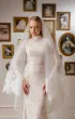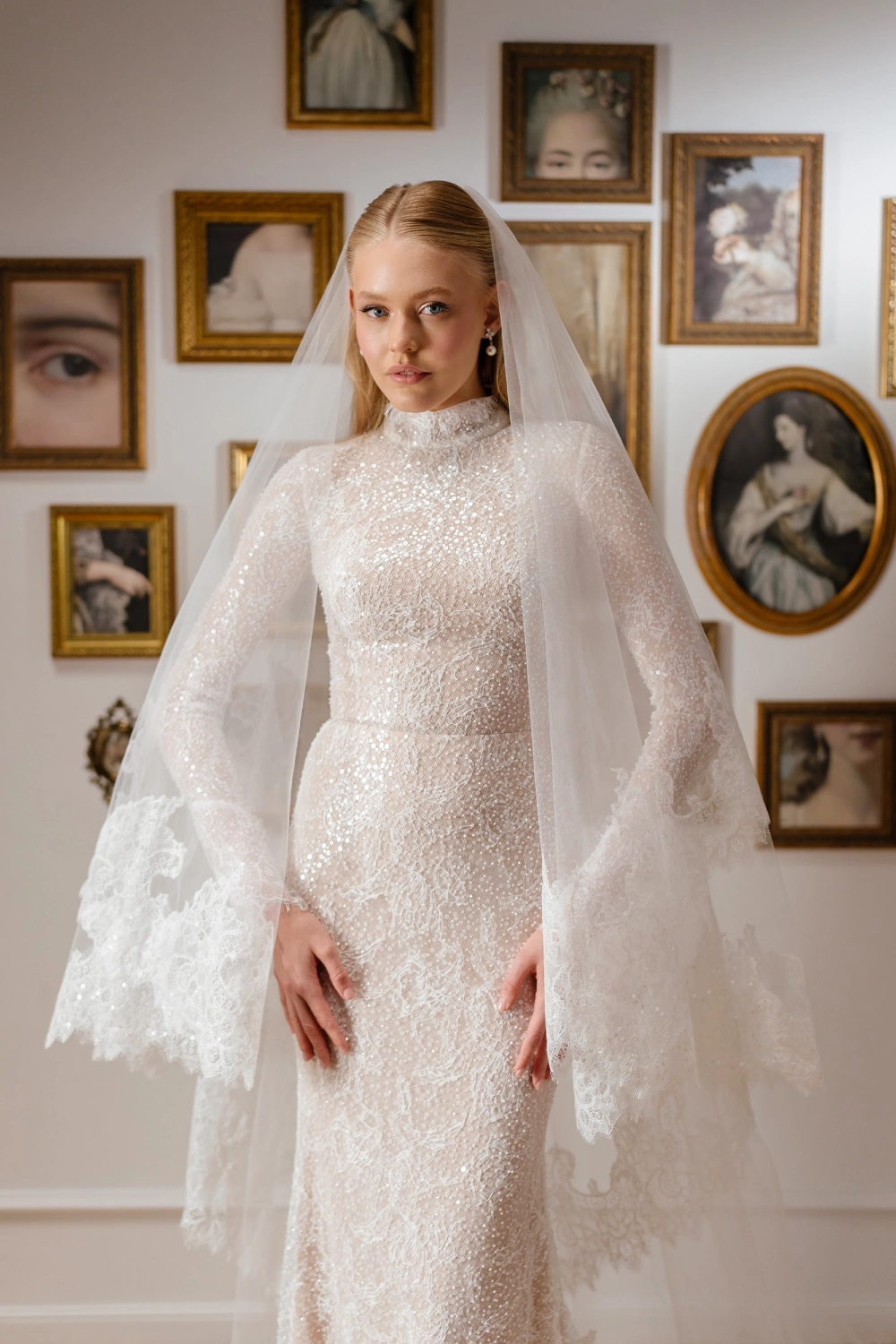 Средняя фата с плотной кружевной отделкой по краям. Графичная и торжественная фата со строгим силуэтом, оформленная плотным кружевом по нижнему краю. Длина до локтей в сочетании с прямой линией делает её идеальной для образов в эстетике ретро, ар-деко или королевской сдержанности.