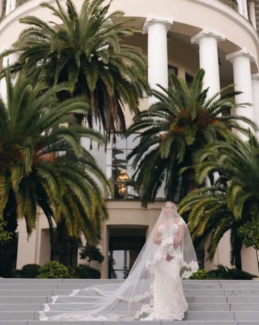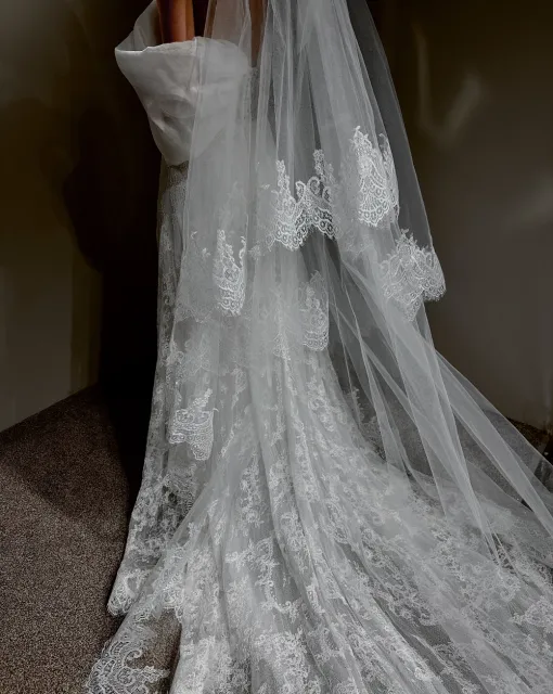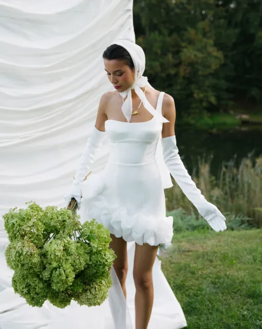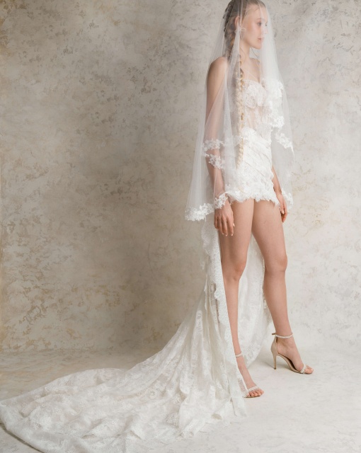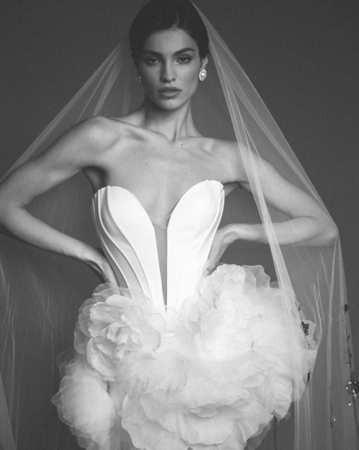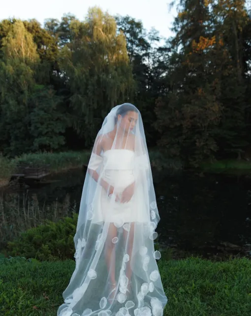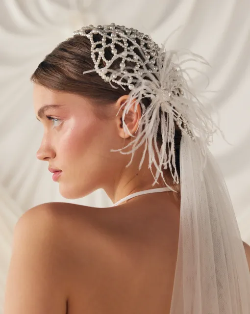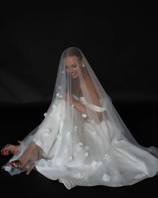 Фата с объемным бантом и вышитым бисером головным элементом. Смелая, запоминающаяся фата для fashion-forward невест. Верх головы украшен расшитым вручную бисерным аксессуаром, напоминающим сетку или шапочку-кольчугу — акцентный элемент, добавляющий образу арт-драматургии и отсылок к высокой моде. К нему крепится полупрозрачная фата, ниспадающая от большого воздушного банта.