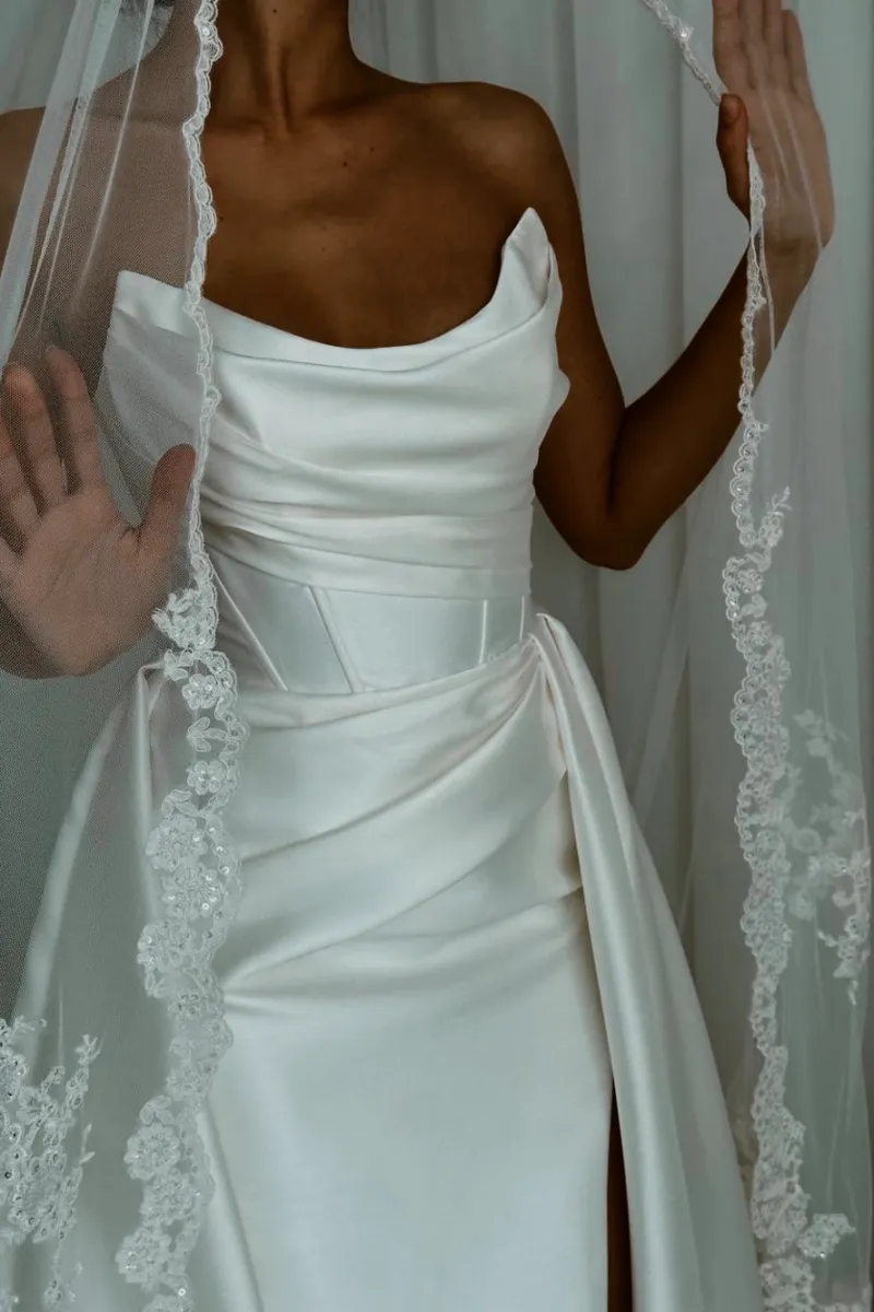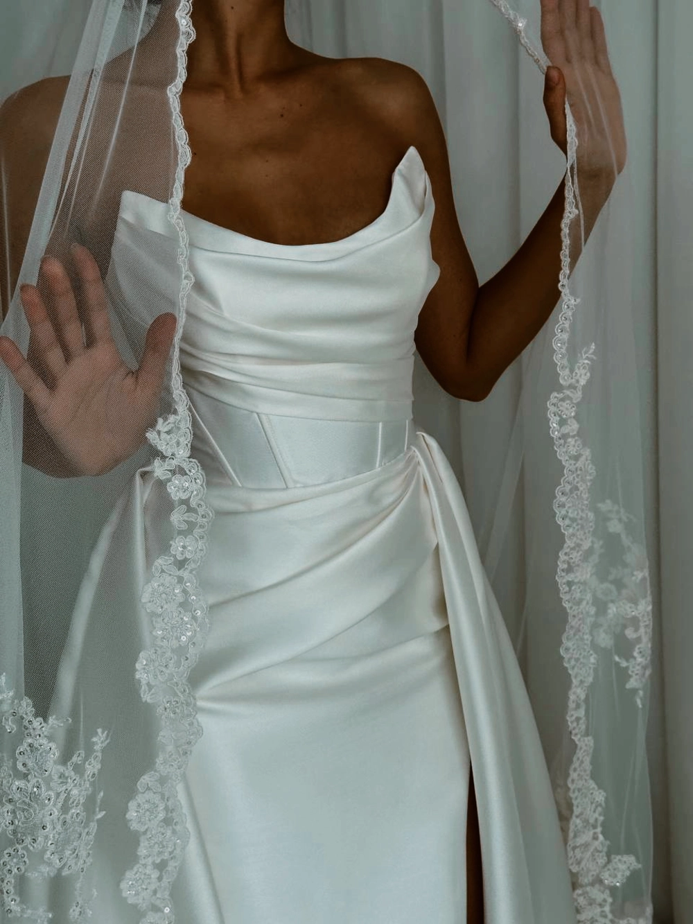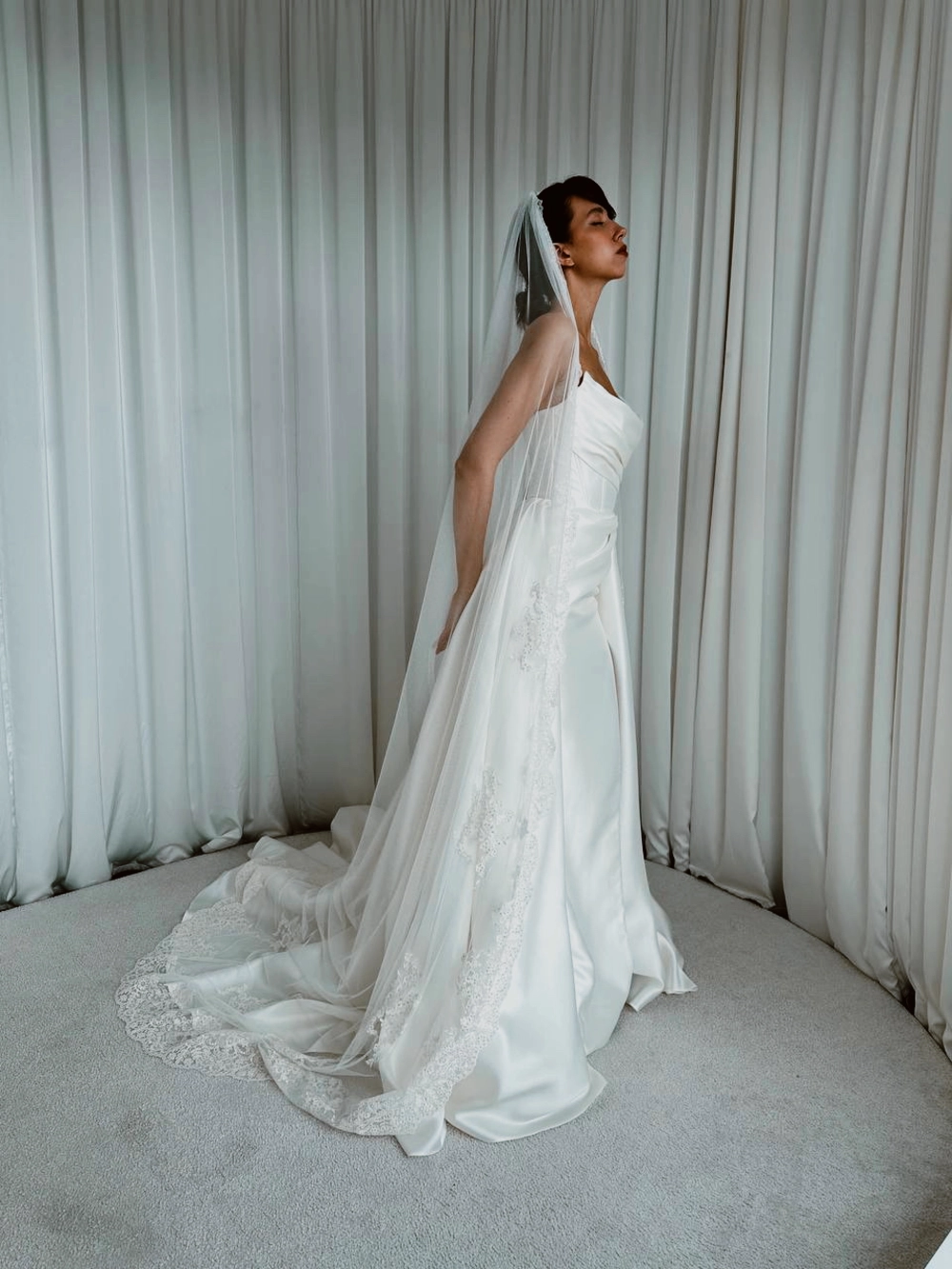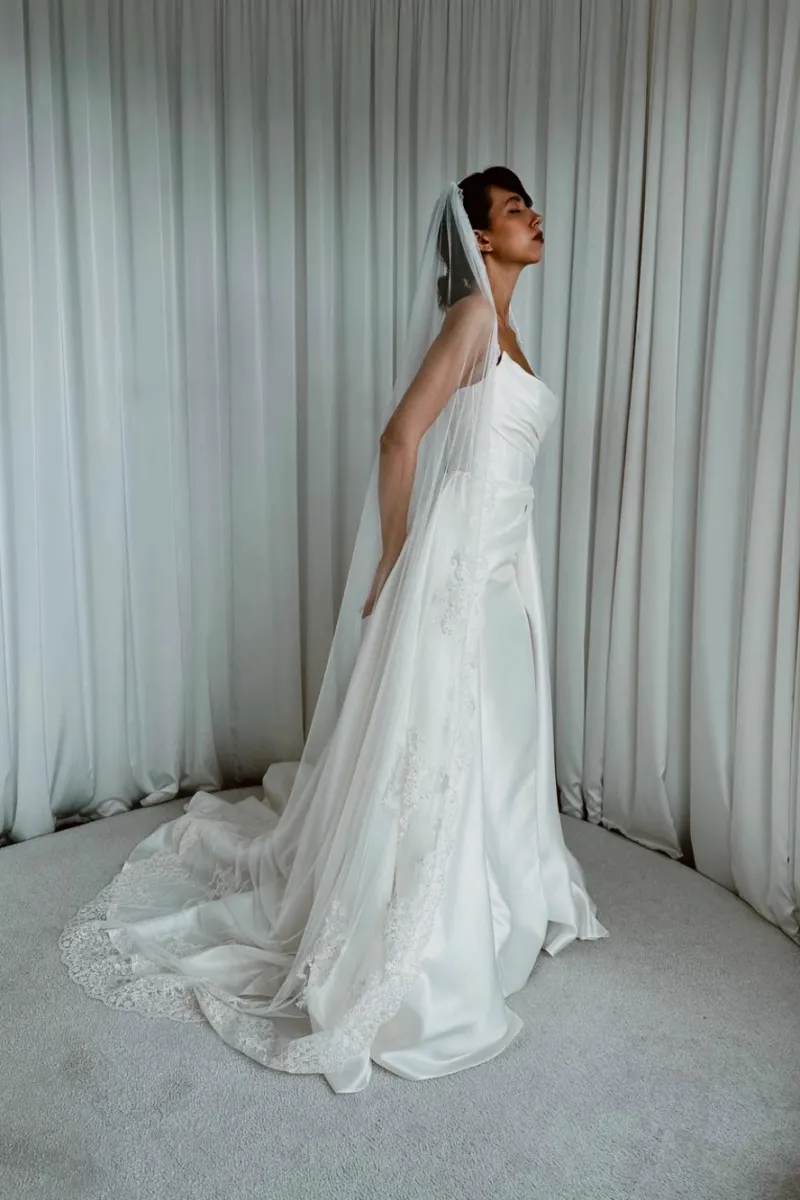 Длинная фата с кружевной каймой. Воздушная фата со шлейфом и изящной кружевной отделкой по краю. Полупрозрачное полотно мягко струится по платью, создавая лёгкий и романтичный акцент. Крепится на макушке, может свободно спадать или закрывать лицо. Подходит как к лаконичным, так и к более нарядным платьям.
