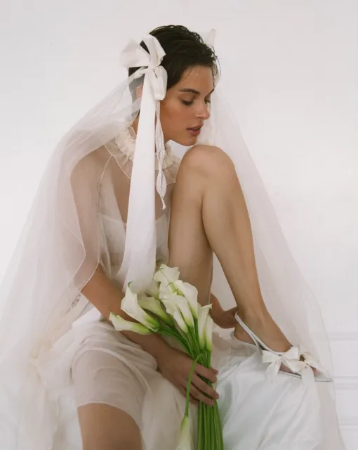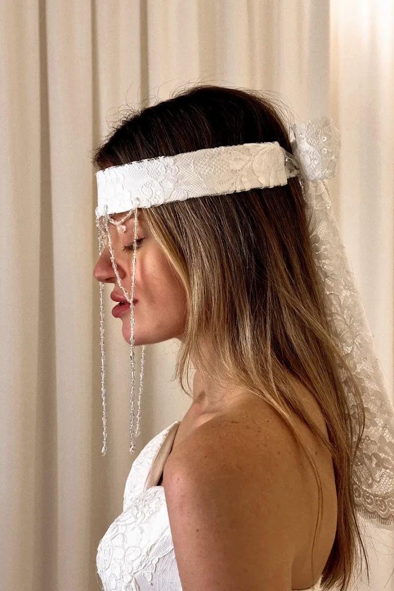 Фата с кружевной повязкой и нитями. Необычная интерпретация свадебной фаты: широкая кружевная повязка на голову с декоративной завязкой сзади и ниспадающими нитями, деликатно обрамляющими лицо. Лёгкий шлейф фаты с узорчатым кружевом дополняет образ. Такая деталь добавит этнические и богемные нотки в стиль невесты.