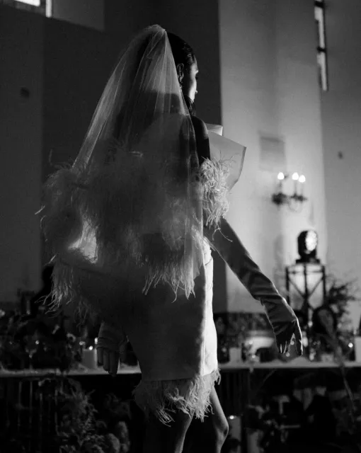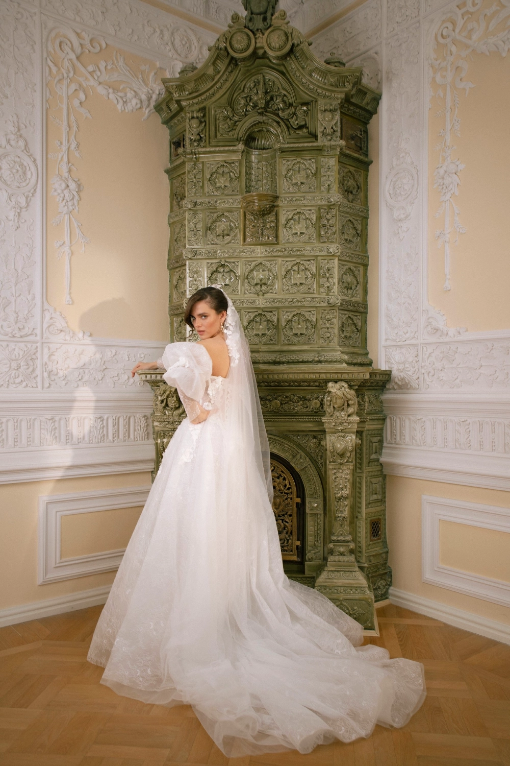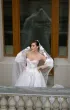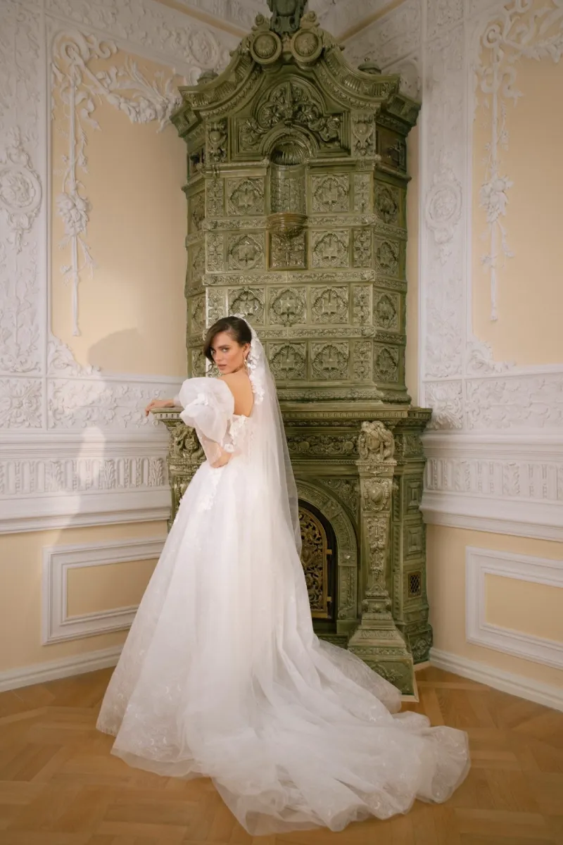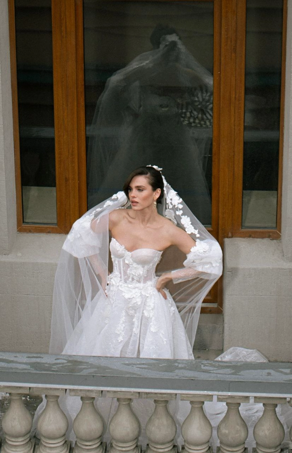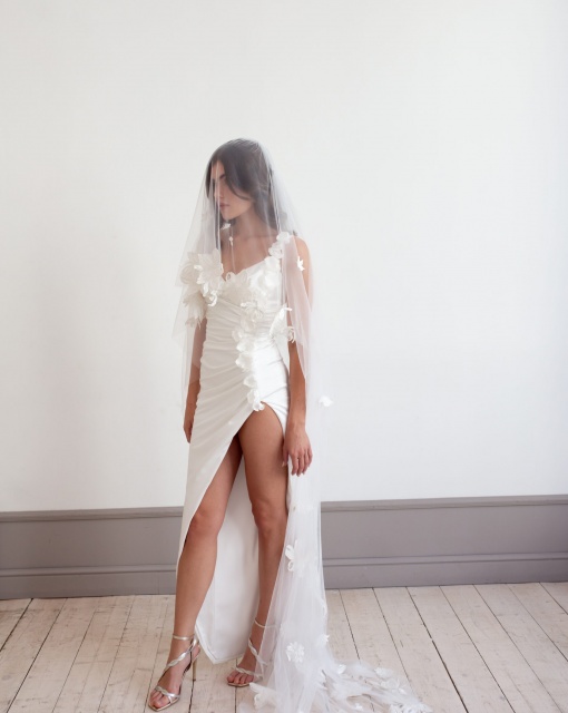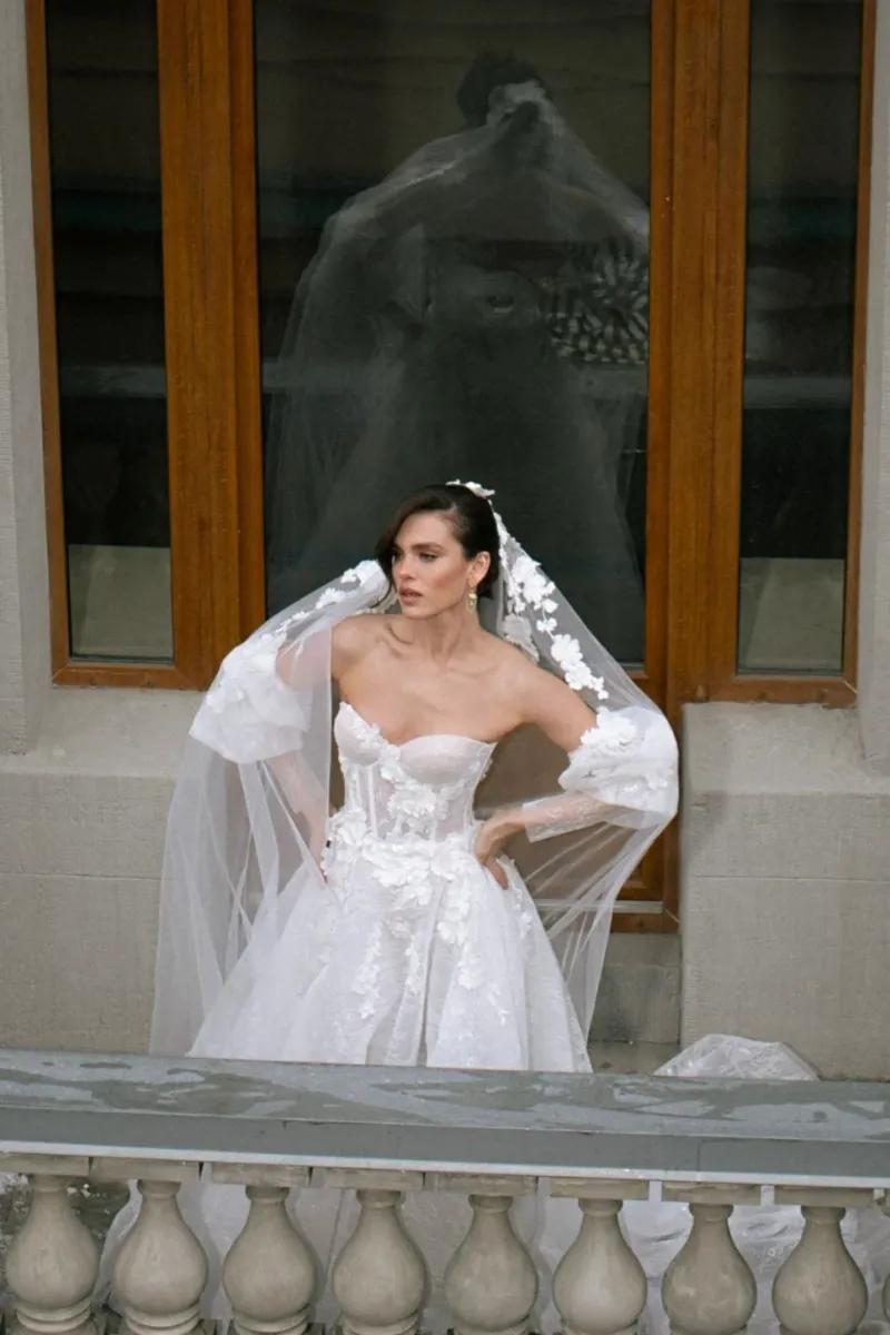 Длинная фата с 3D-цветами и акцентом на макушке. Лёгкая, но выразительная фата с длинным шлейфом и цветочным декором, сосредоточенным в верхней части. Объёмные лепестки эффектно обрамляют лицо и подчёркивают причёску.