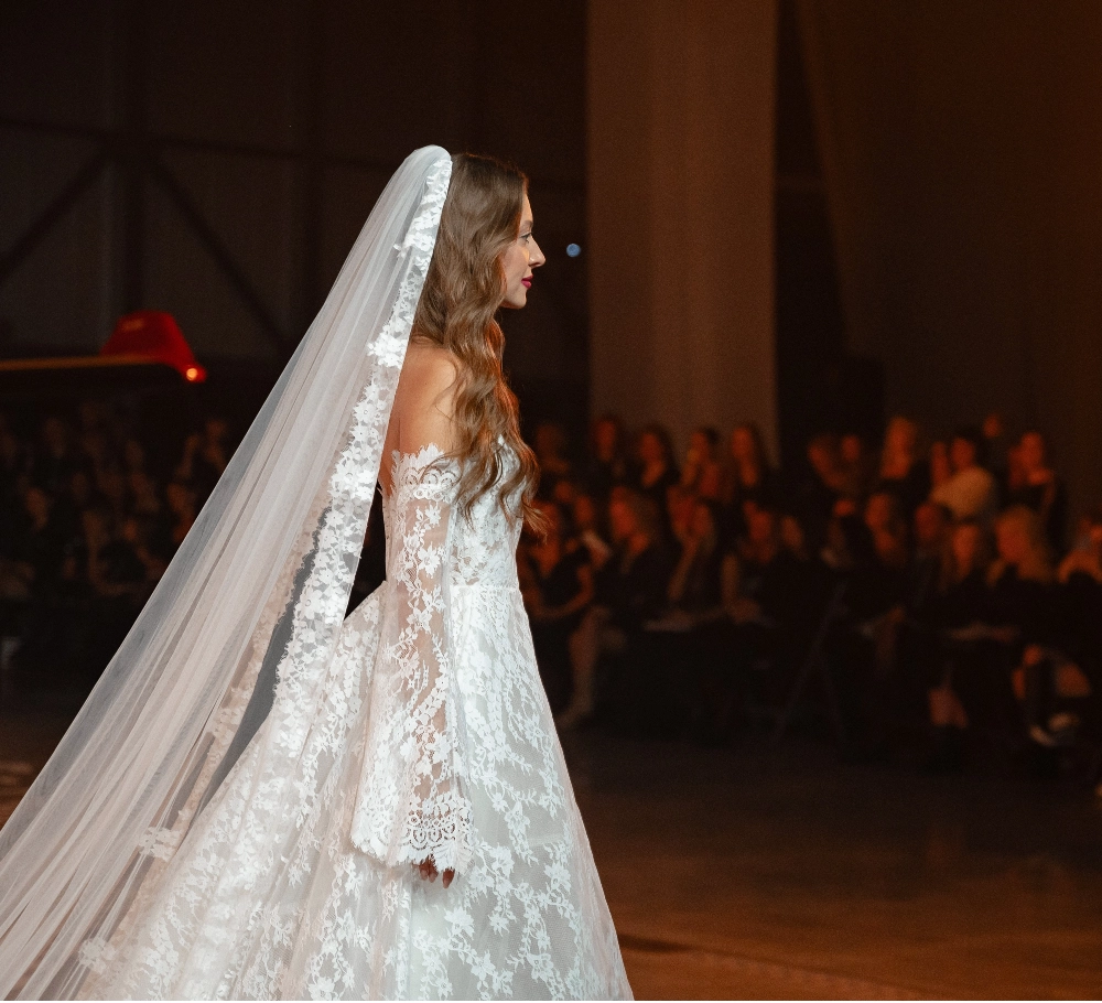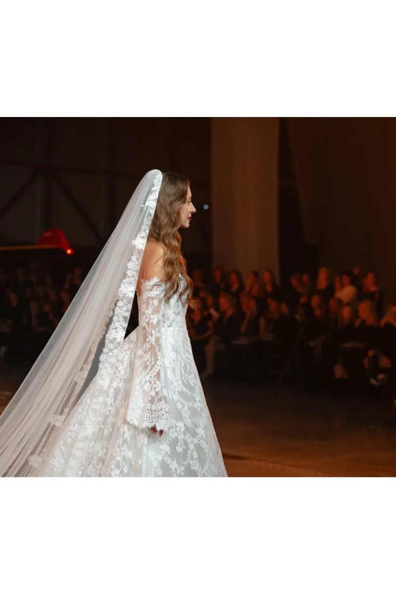 Длинная фата со шлейфом, выполненная из лёгкой сетки и украшенная по краю изящной кружевной окантовкой. Крепление на заколку позволяет удобно фиксировать фату на макушке, создавая гармоничный и романтичный акцент. Элегантный дизайн делает её идеальным дополнением к классическим и современным свадебным платьям.
