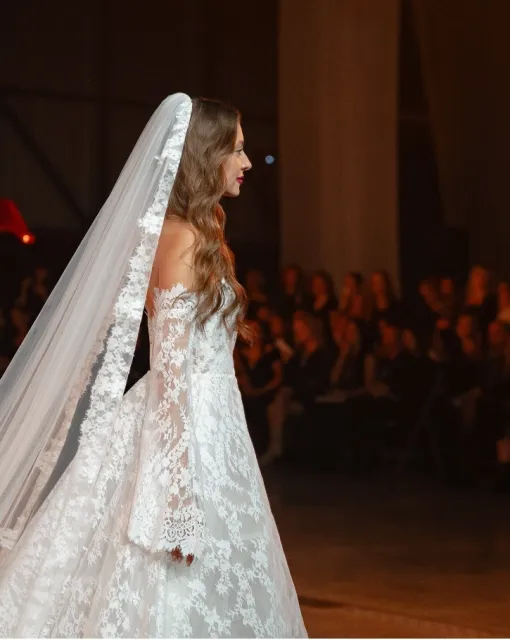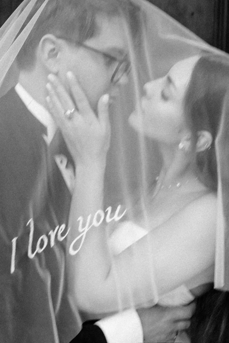Фата средней длины из лёгкой сетки без крепления. Главный акцент — вышитая надпись I love you, добавляющая образу особую символичность и романтичность. Лаконичный дизайн делает её универсальным дополнением как к классическому, так и к современному свадебному стилю.