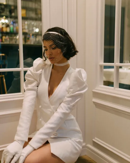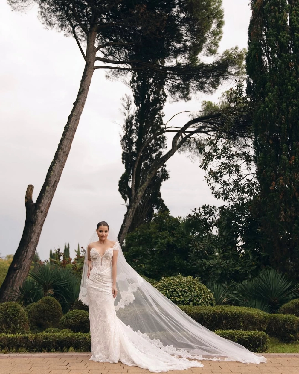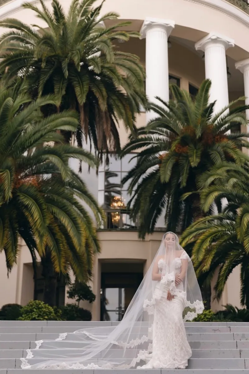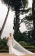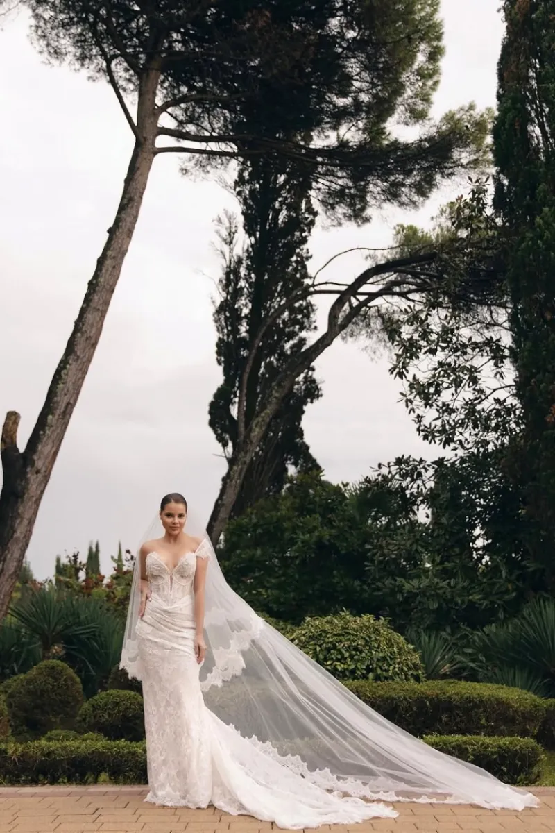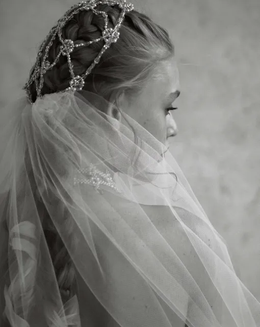Длинная фата с роскошным шлейфом и изящной кружевной окантовкой. Крепление на макушке обеспечивает удобство и вариативность — её можно носить как с закрытым лицом для торжественного выхода, так и открытой, подчёркивая изысканность и элегантность образа.