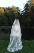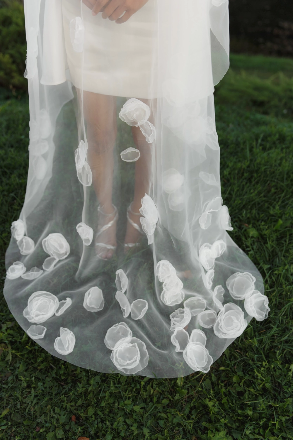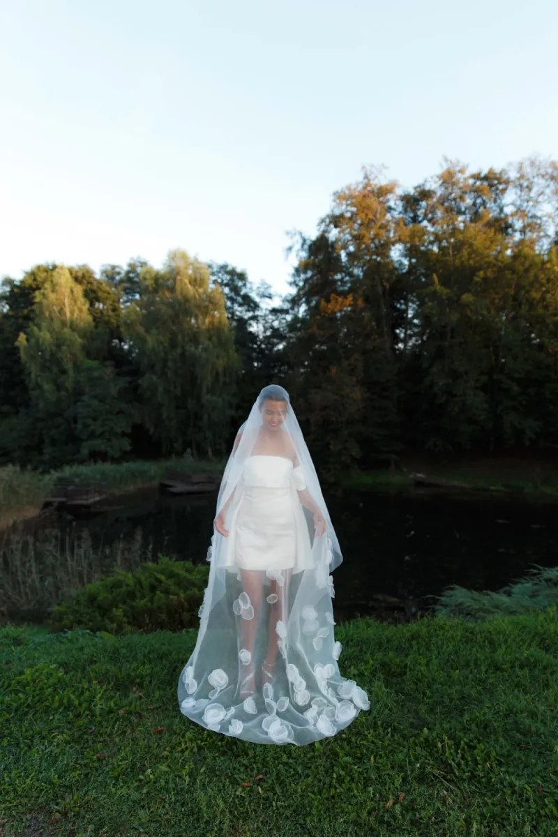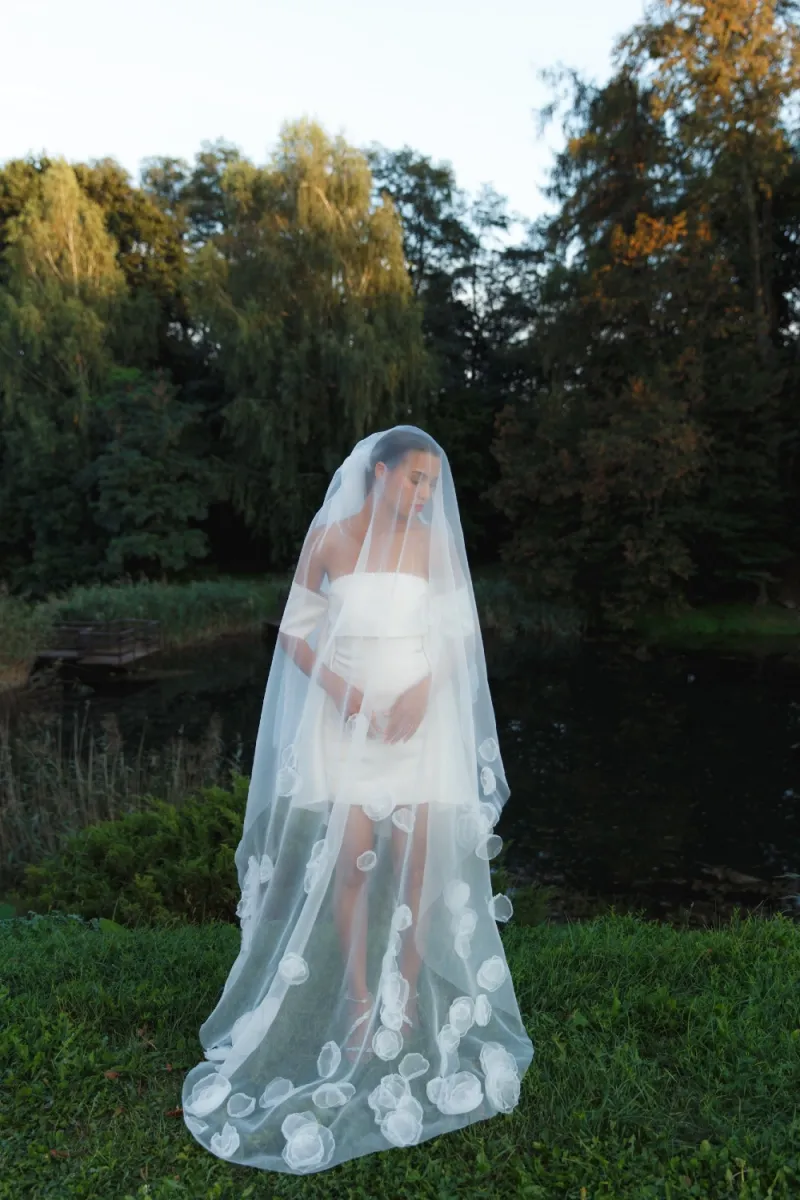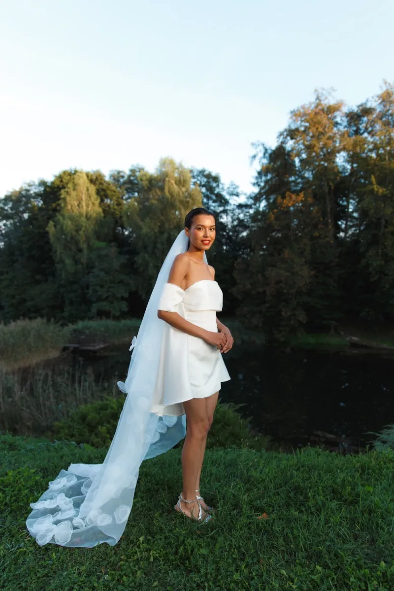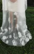 Длинная фата со шлейфом и креплением на макушке. Низ украшен минималистичными цветами, добавляющими нежный акцент. Фата универсальна: её можно носить как классически, так и накинуть на лицо для более романтичного образа.
