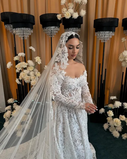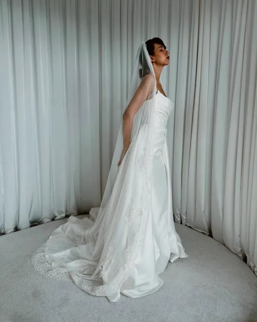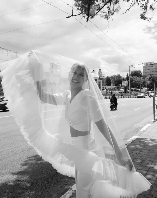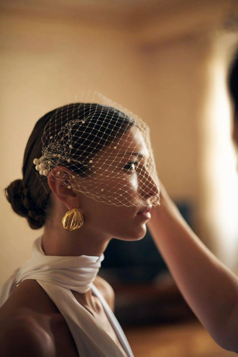 Минималистичная вуаль-сеточка с декоративными бусинами. Крепится сбоку с помощью заколки, слегка прикрывая лицо. Декор в виде жемчужных акцентов добавляет образу винтажную изысканность и лёгкую драму. Современная альтернатива классической фате — для невест, которые выбирают стиль с характером.