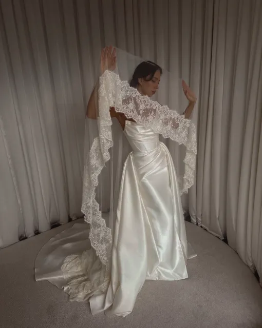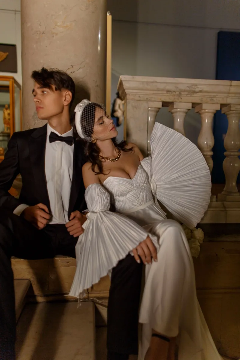 Ободок с вуалью — графичный акцент в bridal-образе. Объёмный ободок с бантом, обтянутый атласом, дополнен короткой вуалью-сеткой, деликатно прикрывающей лицо. Элегантная интерпретация ретро-стиля 60-х, идеально сочетается с открытыми лифами, платьями-корсетами и винтажными украшениями. Выразительно, модно и легко адаптируется под вечерние или свадебные образы.