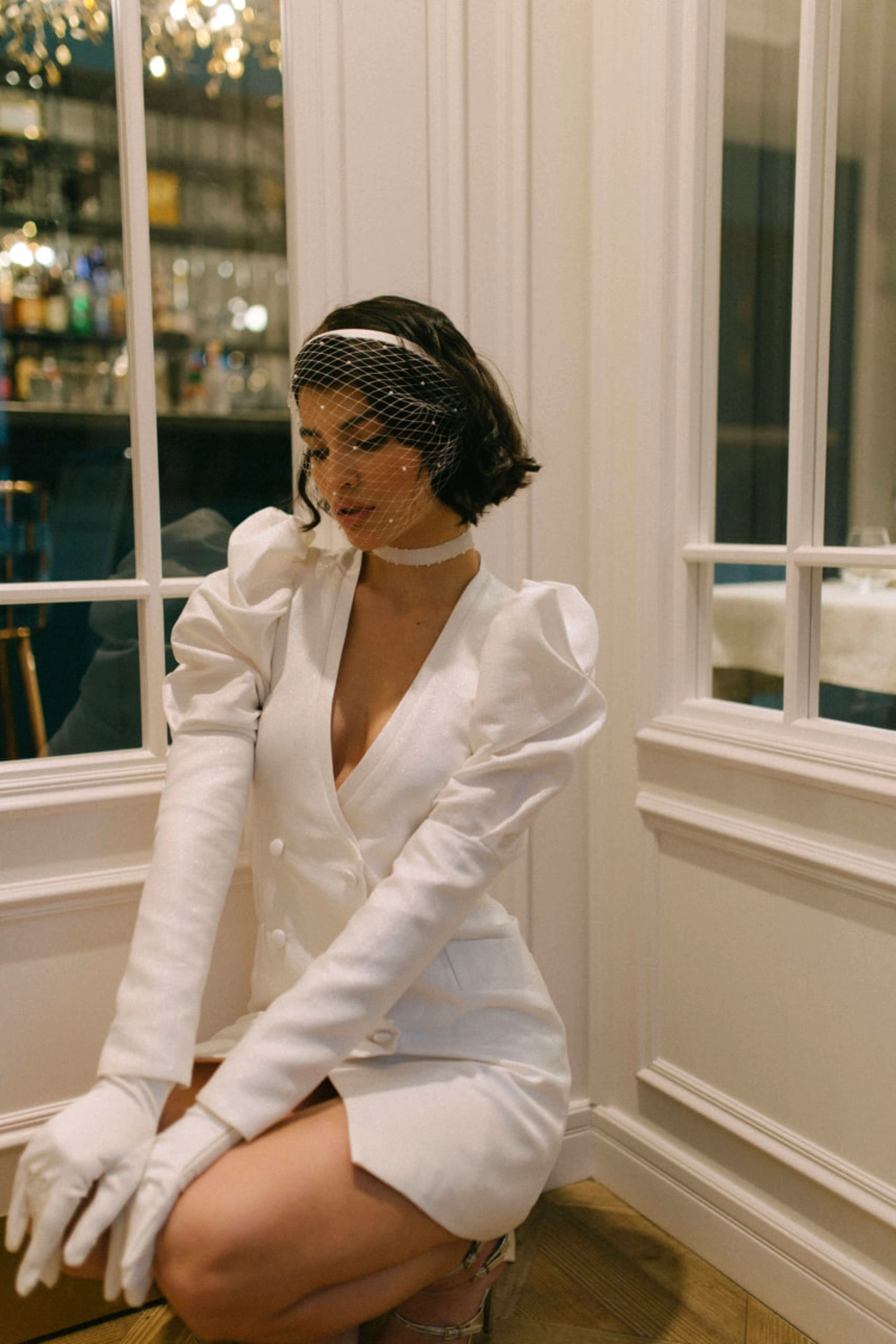 Ободок с вуалью-сеткой в духе нео-ретро. Тонкий сатиновый ободок с креплением вуали, закрывающей лицо мягкой сеткой. Минималистичный, но выразительный акцент, идеально сочетающийся с платьями с объёмными рукавами и винтажными силуэтами. Лёгкий намёк на 60-е в современном прочтении — для невест и гостей, которые ценят эстетику с характером.