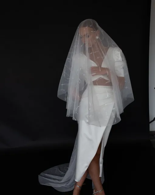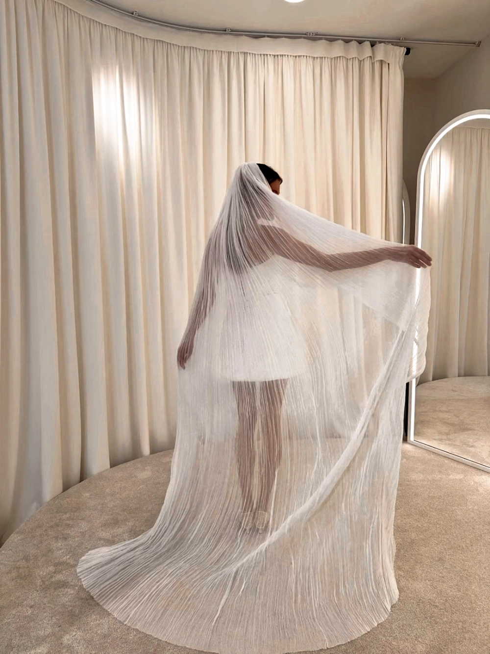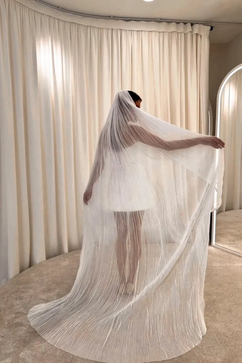 Фата из натурального шёлка с эффектом мелкой плиссировки. Лёгкая, текучая, невесомая — создаёт ощущение живого движения в каждом шаге. Выполнена из 100% шёлка, что придаёт ей мягкий блеск и особую чувственность. Форма позволяет использовать её как драпировку поверх головы или крепить в причёску, создавая современный и минималистичный bridal-образ с высокой эстетикой.