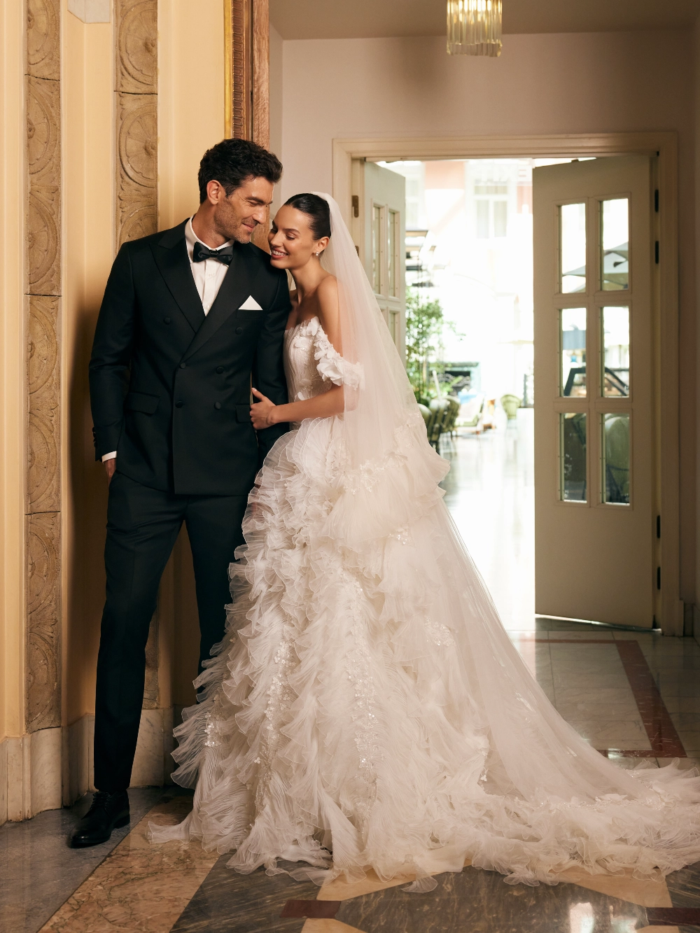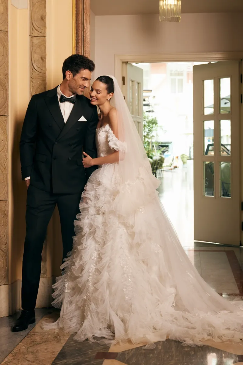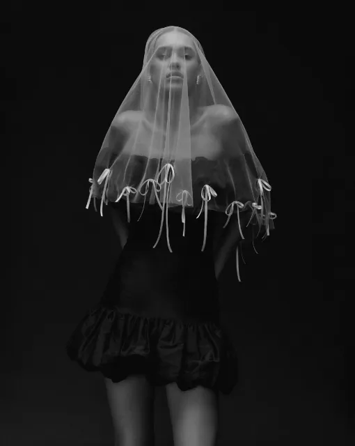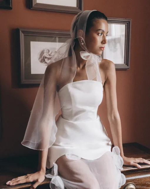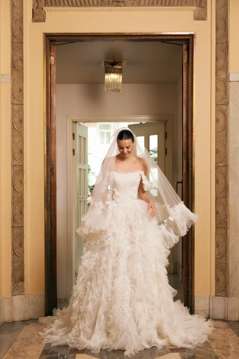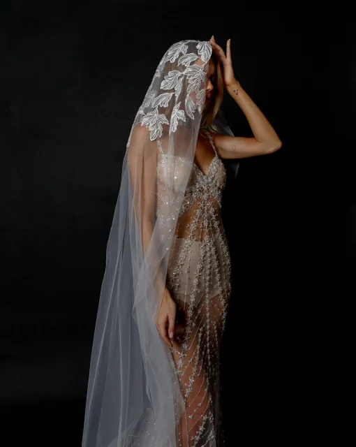Длинная фата с шлейфом и объёмным декором из цветов и оборок.. Изготовлена из тонкой фатиновой сетки, украшенной расшитыми цветами и воздушными воланами по бокам. Мягко обрамляет лицо и плечи, подчёркивая романтичность образа. Эта модель идеально сочетается с пышными платьями и подходит для невест, мечтающих о сказочной свадьбе с ноткой высокой моды.