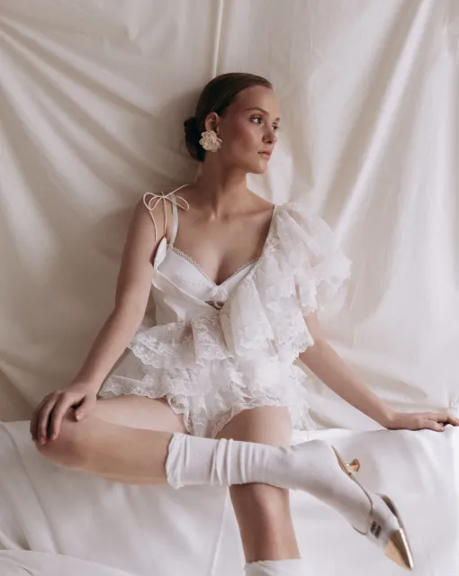 Нежный и воздушный комплект Cinderella состоит из лифа корсетного типа и трусиков с высокой посадкой. Бретели-завязки из фатина можно надевать как на плечи, так и спускать на руки, что позволяет создавать разные образы. Бретели –съемные, поэтому при желании их можно отстегнуть и оставить только классические эластичные бретели. На чашках - драпировка-рюша из блестящей ткани, как на бретелях, а также бантик, пришитый по центру. Трусики дополнены резинками с регулировками по бокам, что позволяет улучшить посадку под конкретную фигуру.