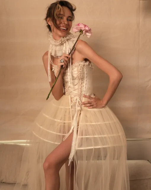 Легкий длинный пеньюар Flin с длинными объемными рукавами. Рукава декорированы пышными перьями. Пеньюар завязывается поясом на запах.