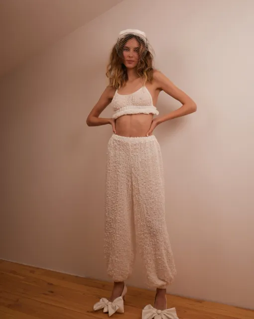 Комплект свадебного белья состоит из двойного лифа и трусиков с завышенной талией. Передняя часть трусиков состоит из двойного слоя, имитирующего форму других трусиков.