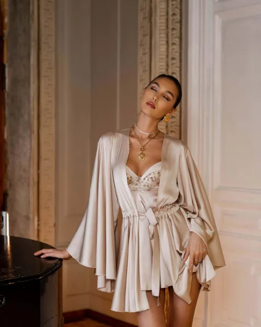 Комплект свадебного белья состоит из лифа и трусиков. Свадебный комплект украшен белыми строчками.
