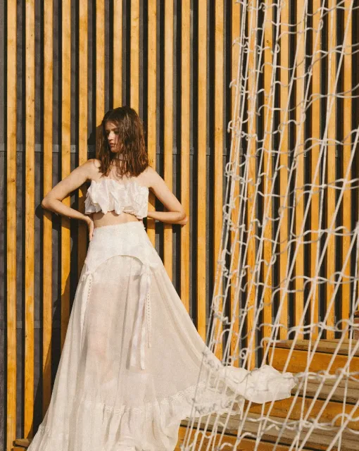 Нежная сорочка Sara сочетает в себе игривость кружева и легкость шифона. В комплект к ней идут трусики, украшенные кружевом спереди. Сама сорочка также не осталась без внимания: чашка украшена кружевными элементами, вручную расшитыми тесьмой с бусинами, а по центру сорочки расположен бантик с бусиной.