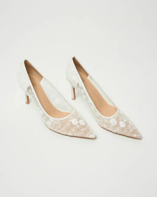 Туфли молочного цвета с воланами-крылышками возле лодыжки. Застежка регулируется пряжкой. Спереди туфели выполнены из прозрачного материала и декорированы кружевом шантильи. Пятка закрыта и покрыта сатиновой тканью.