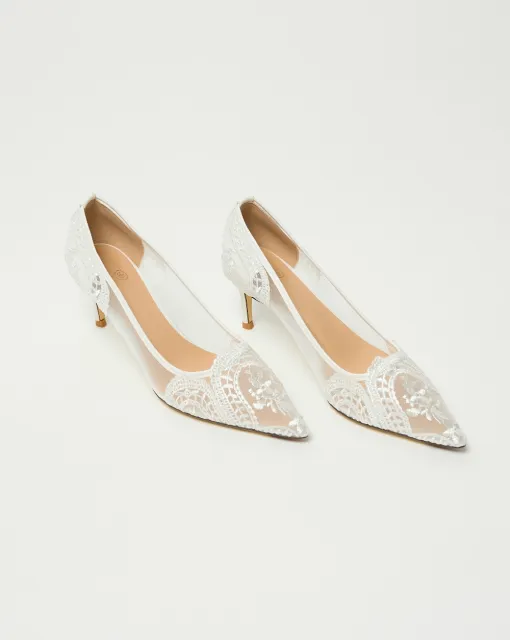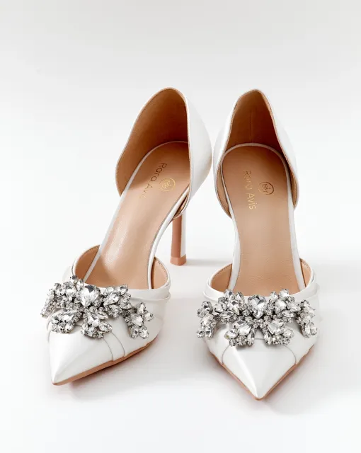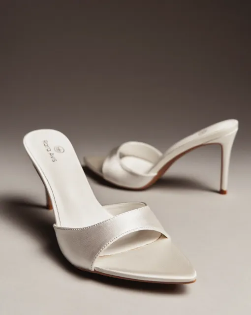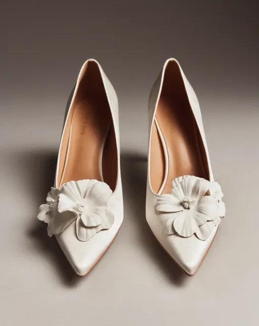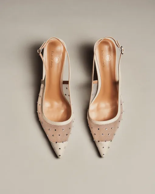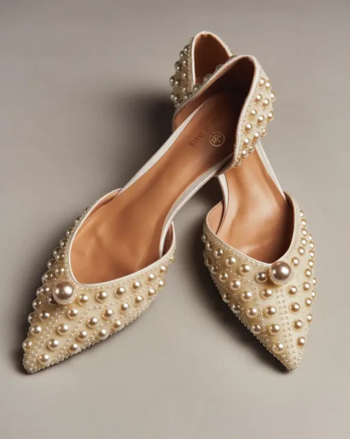 Балетки из кожи цвета слоновой кости. По верху туфель выполнена драпировка, формирующая бант. По центру банта размещена жемчужина. Внутри туфли выполнены из кожи, пятка дополнительно покрыта тканью. Каблук обрамлен золотой зеркальной кромкой.