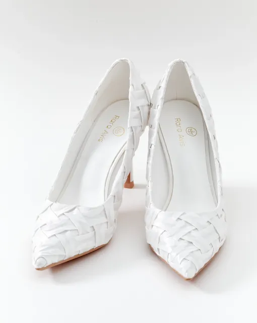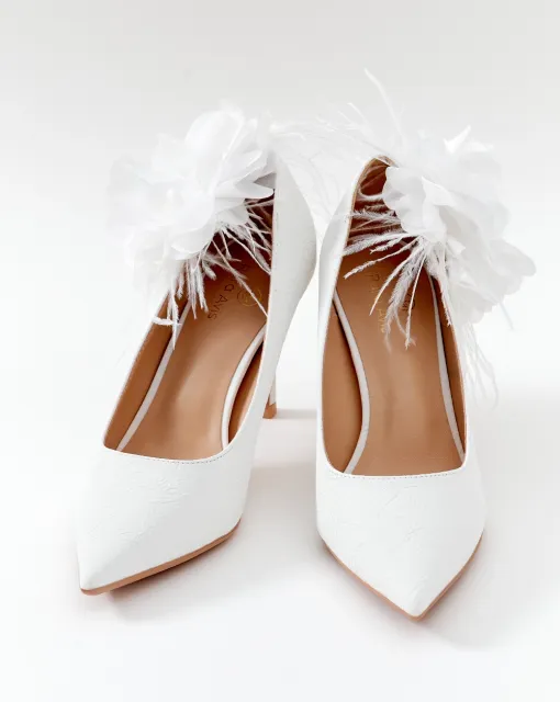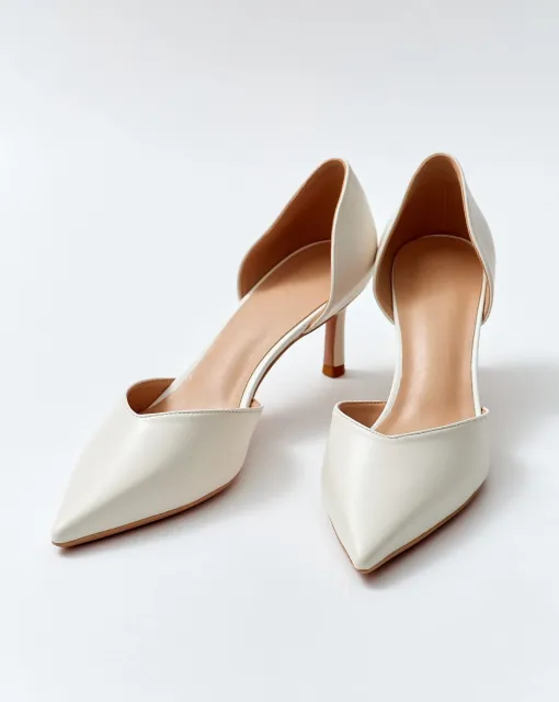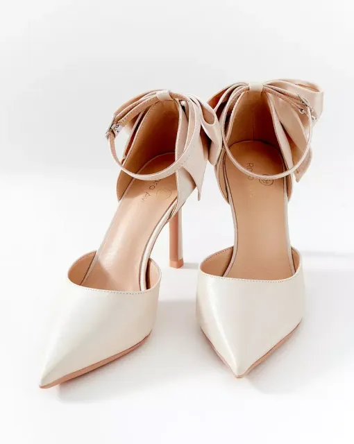 Лаковые лодочки в молочном цвете. Нос туфель украшен ожерельем из переплетающихся бусин. Внутри туфли выполнены из кожи.