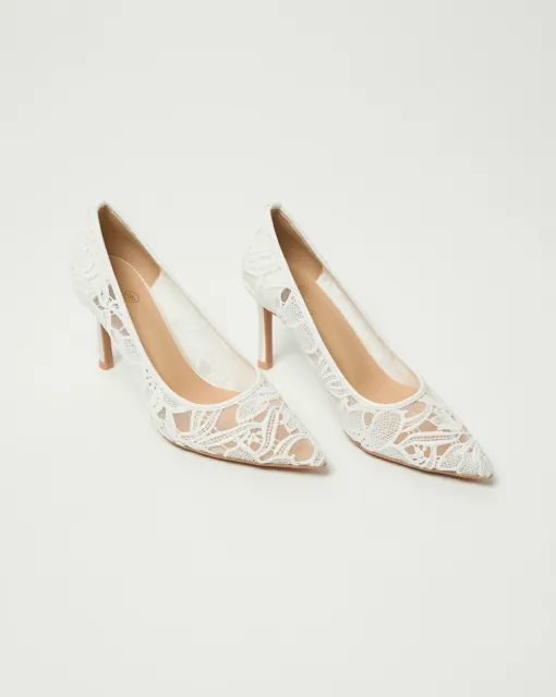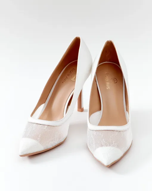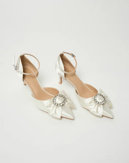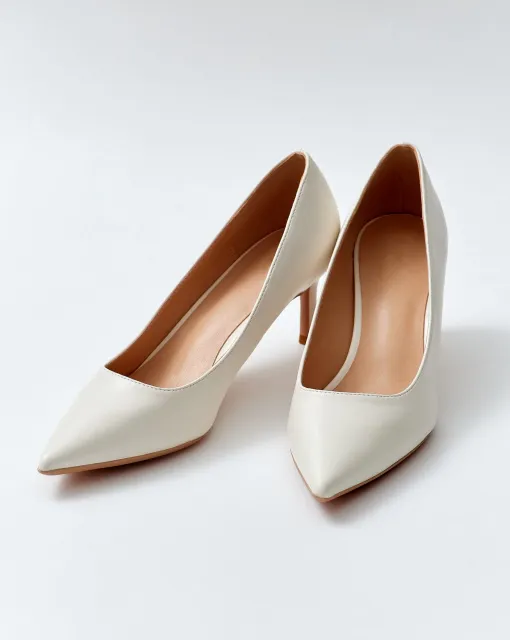 Классические полуоткрытые лодочки. Могут быть выполнены из кожи молочного цвета, или сатина в цвете пудра или молоко. Пятка дополнительно покрыта тканью.