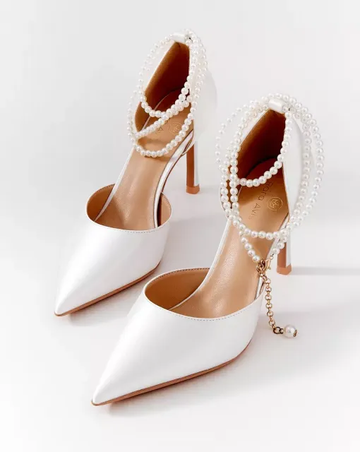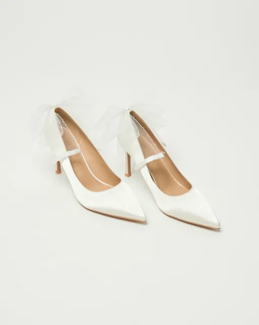 Классические полуоткрытые лодочки. Могут быть выполнены из кожи молочного цвета, или сатина в цвете пудра или молоко. Пятка дополнительно покрыта тканью.