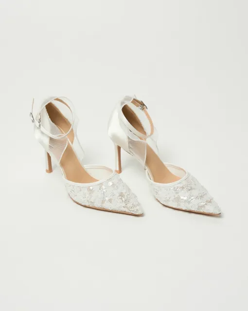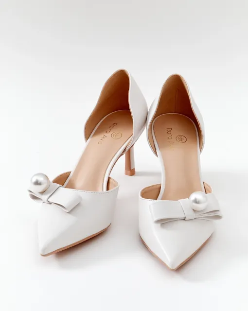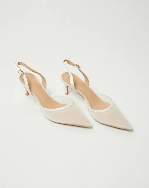 Классические полуоткрытые лодочки. Могут быть выполнены из кожи молочного цвета, или сатина в цвете пудра или молоко. Пятка дополнительно покрыта тканью.
