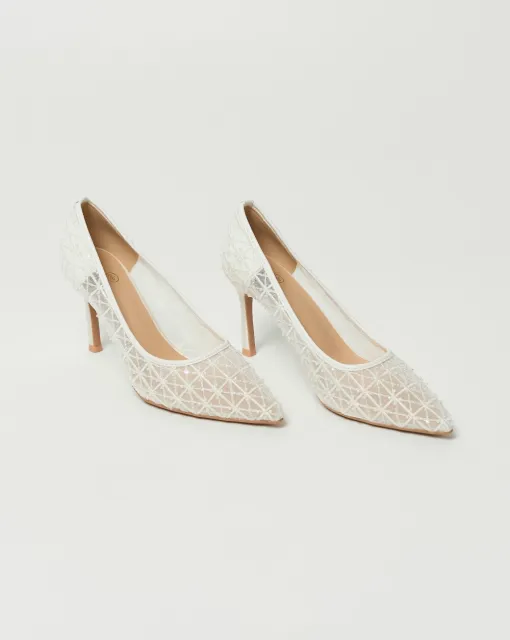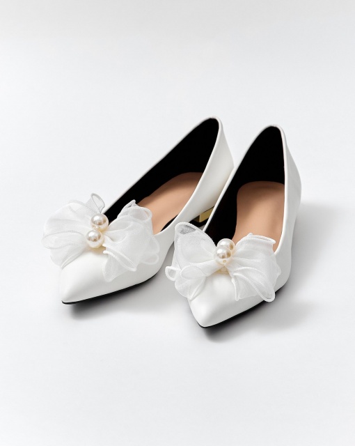 Лодочки в белом цвете на высоком каблуке. Ремешок вокруг лодыжки надежно фиксирует ногу, поэтому невесте не стоит переживать за открытые бока. Нос пары выполнен из кружева, что добавляет ей романтичности.