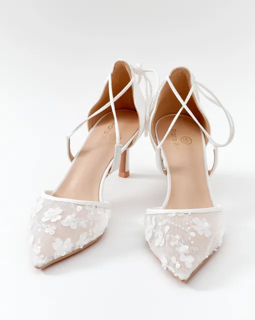 Классические лодочки в белом цвете с открытыми боками. Акцент в данной модели сделан на полупрозрачный цветок, размещающийся на носке туфель.
