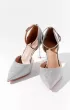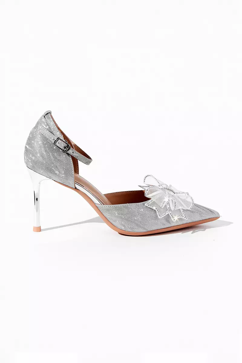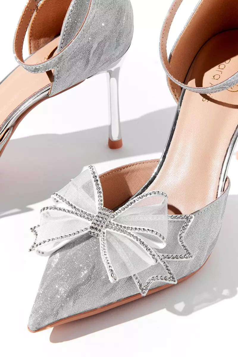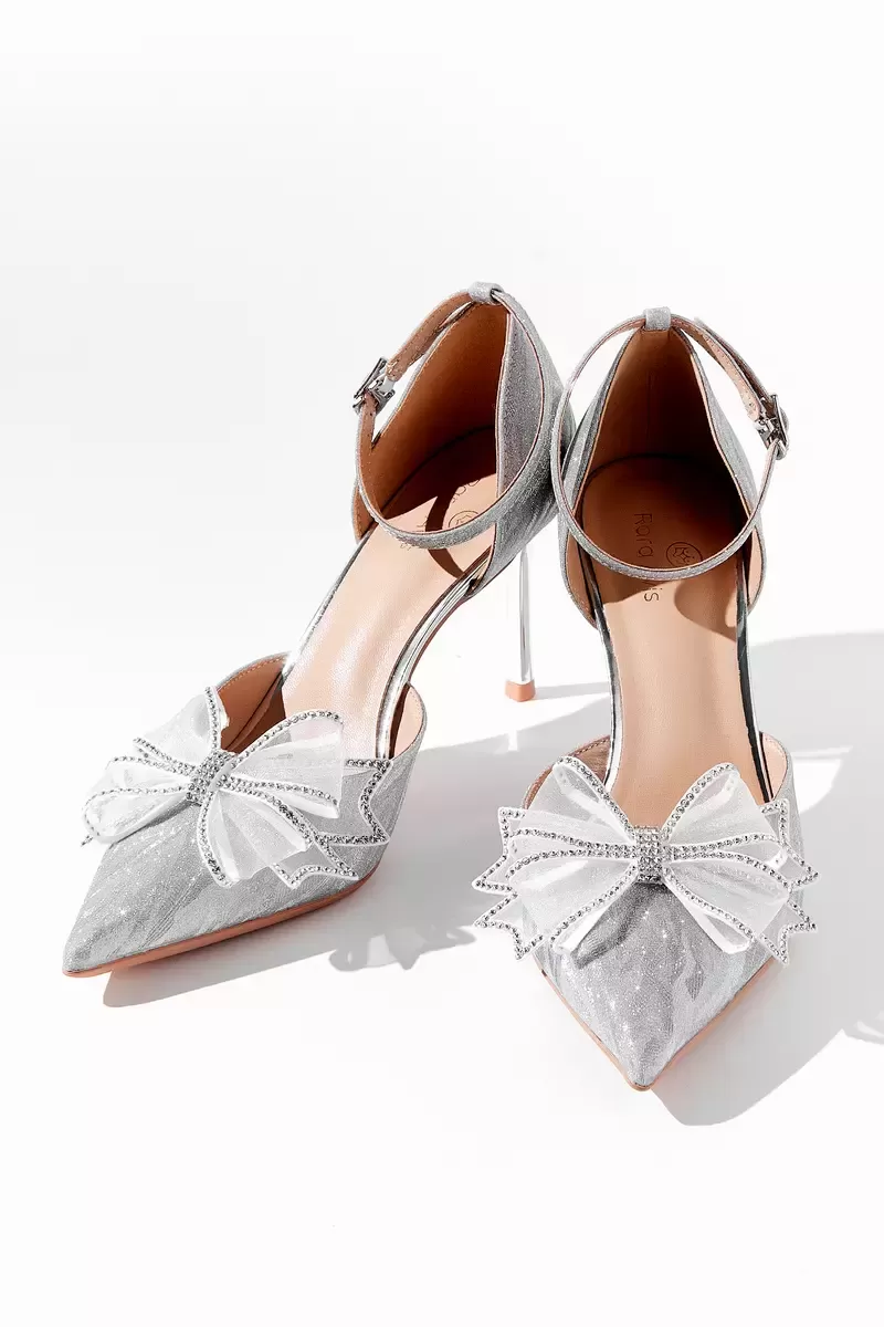 Вариация классических лодочек – полуоткрытые босоножки серебристого цвета. Тонкий ремешок вокруг лодыжки надежно фиксирует ногу. Нос данной пары дополняет полупрозрачный бант, декорированный стразами.