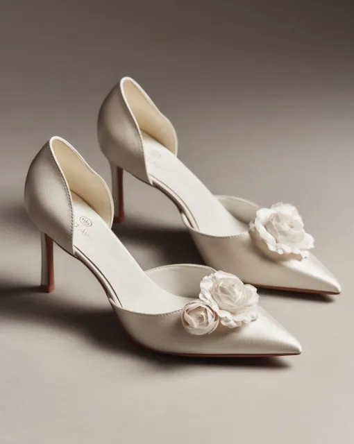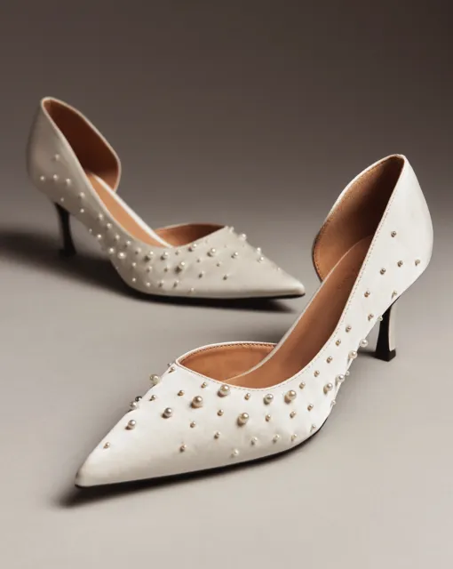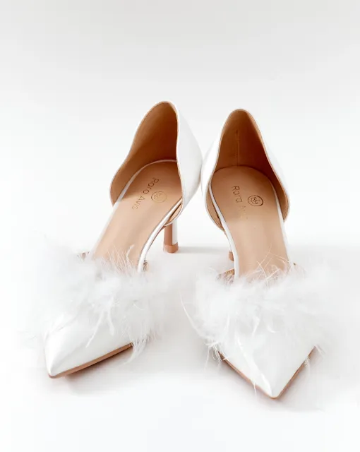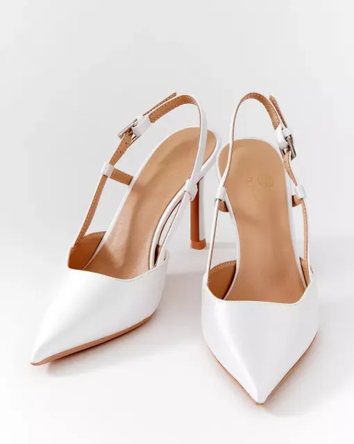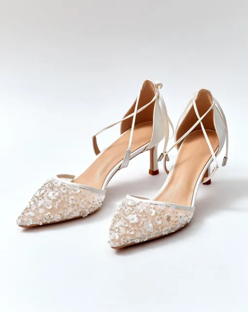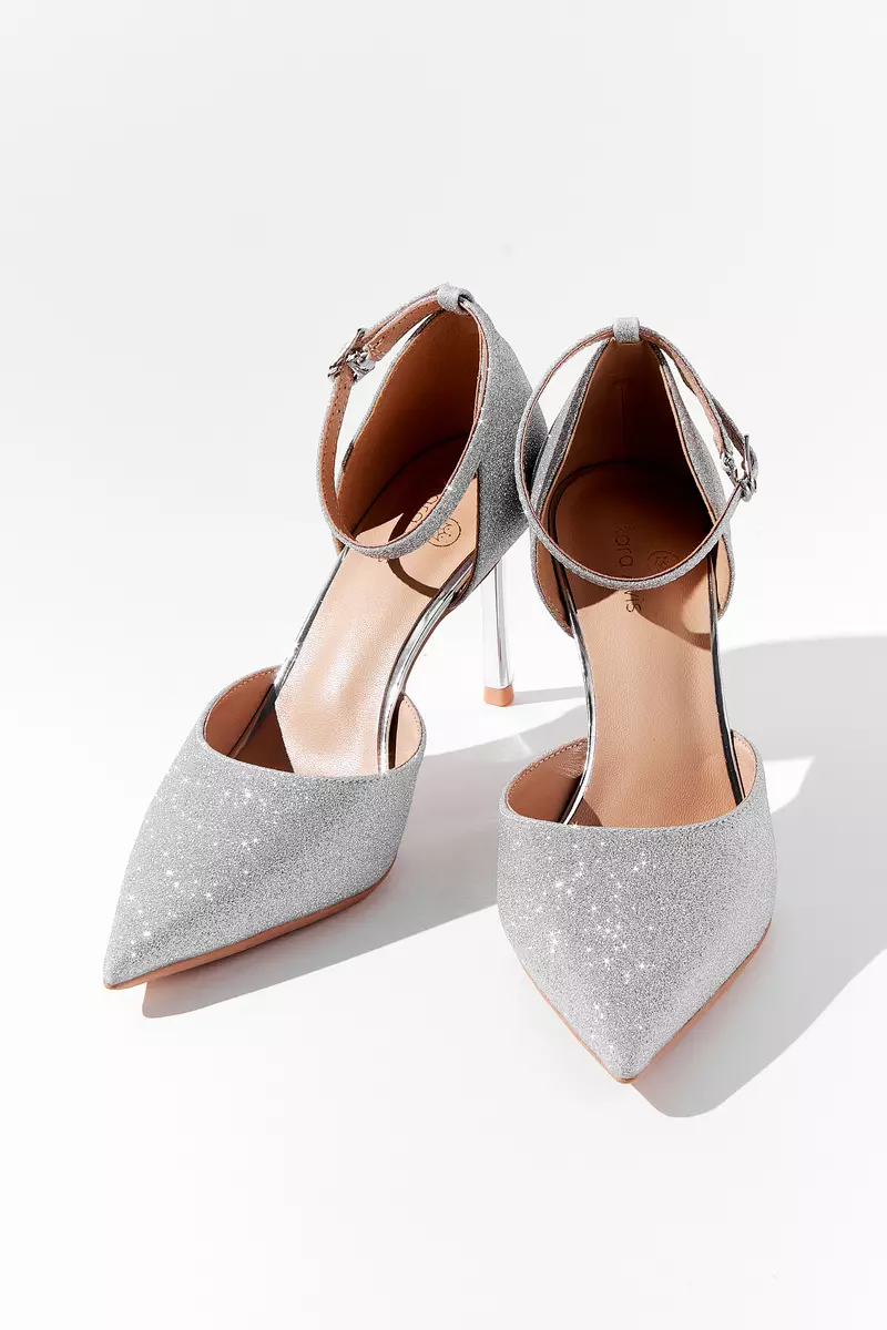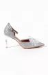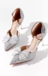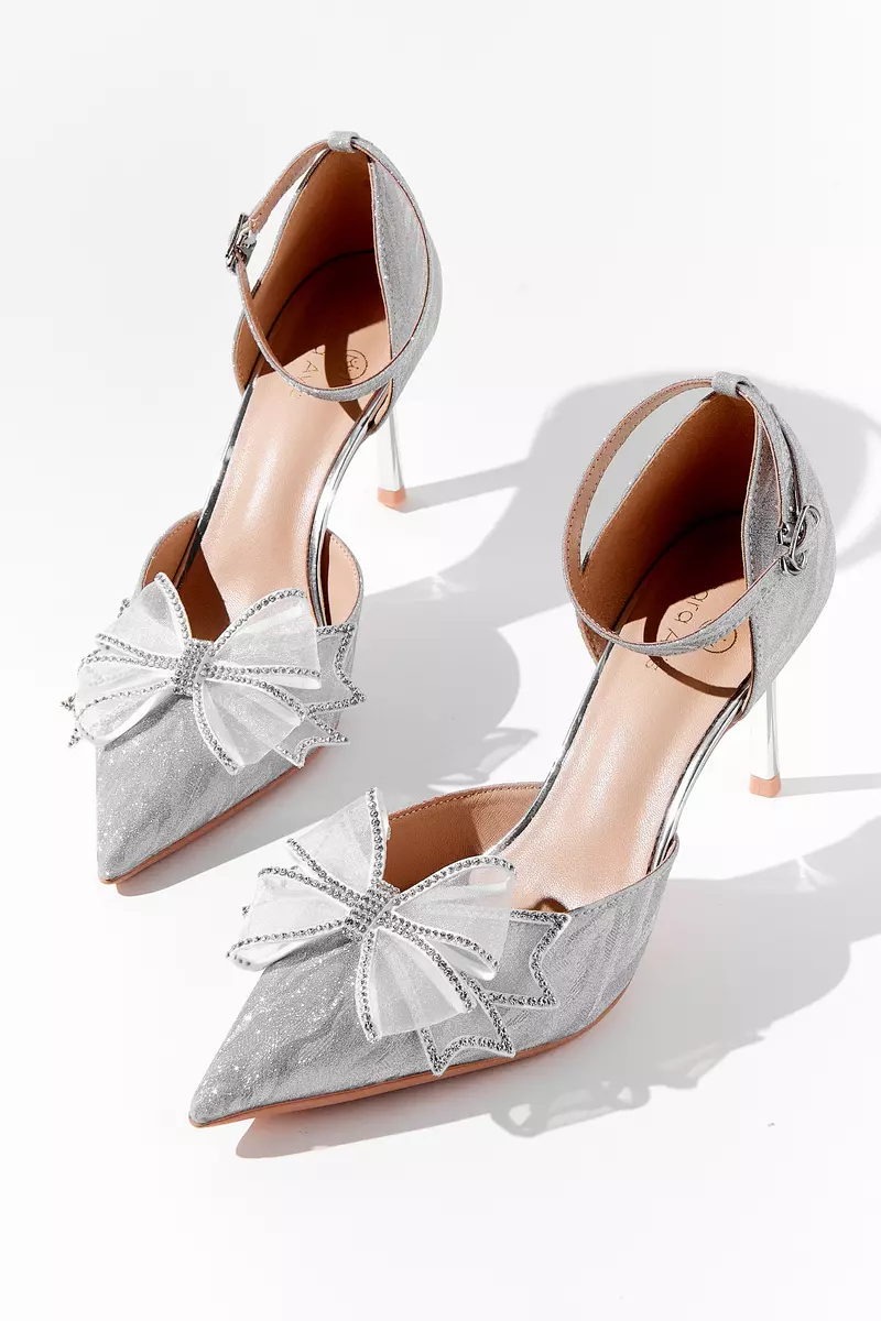 Вариация классических лодочек – полуоткрытые босоножки серебристого цвета. Тонкий ремешок вокруг лодыжки надежно фиксирует ногу. Нос данной пары дополняет полупрозрачный бант, декорированный стразами.
