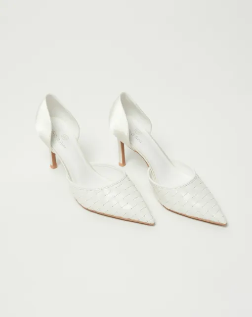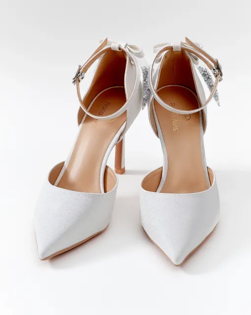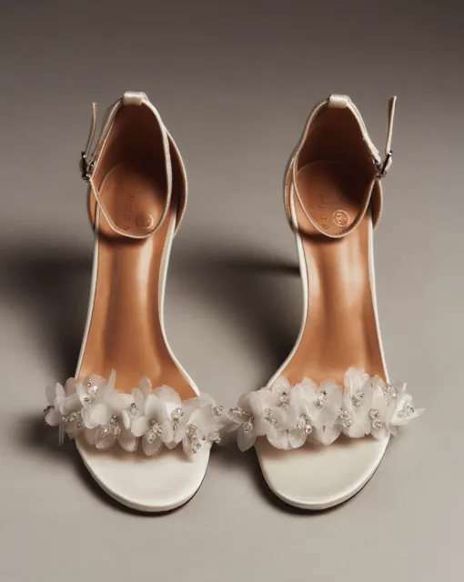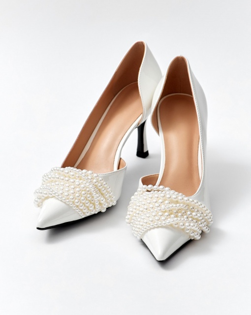 Классические лодочки на низком каблуке с фигурным вырезом по внутренней стороне пары. Нос модели украшен драпировкой и объемным цветком с серединой из бисера.