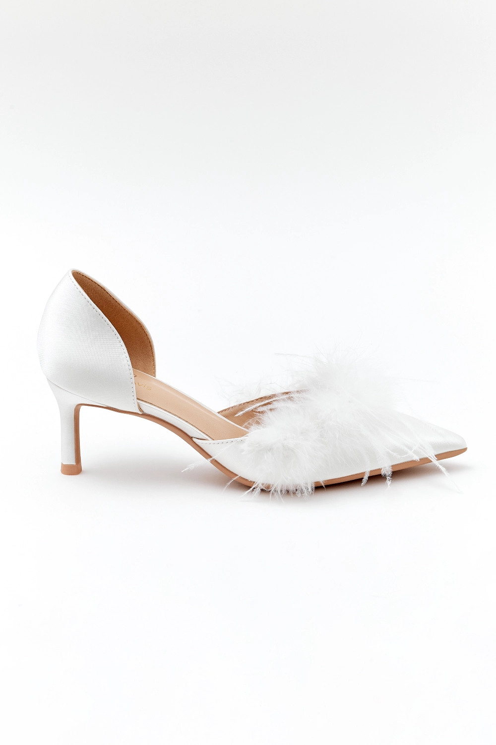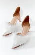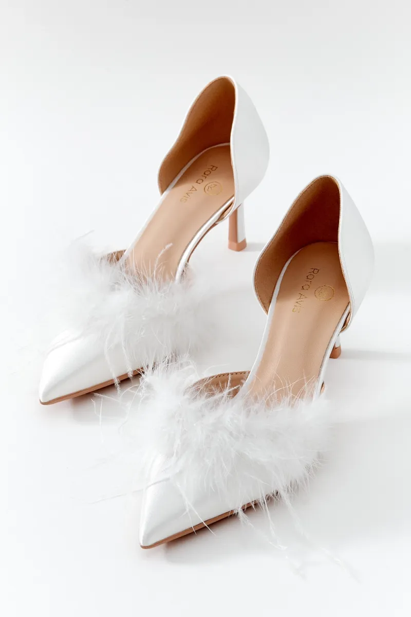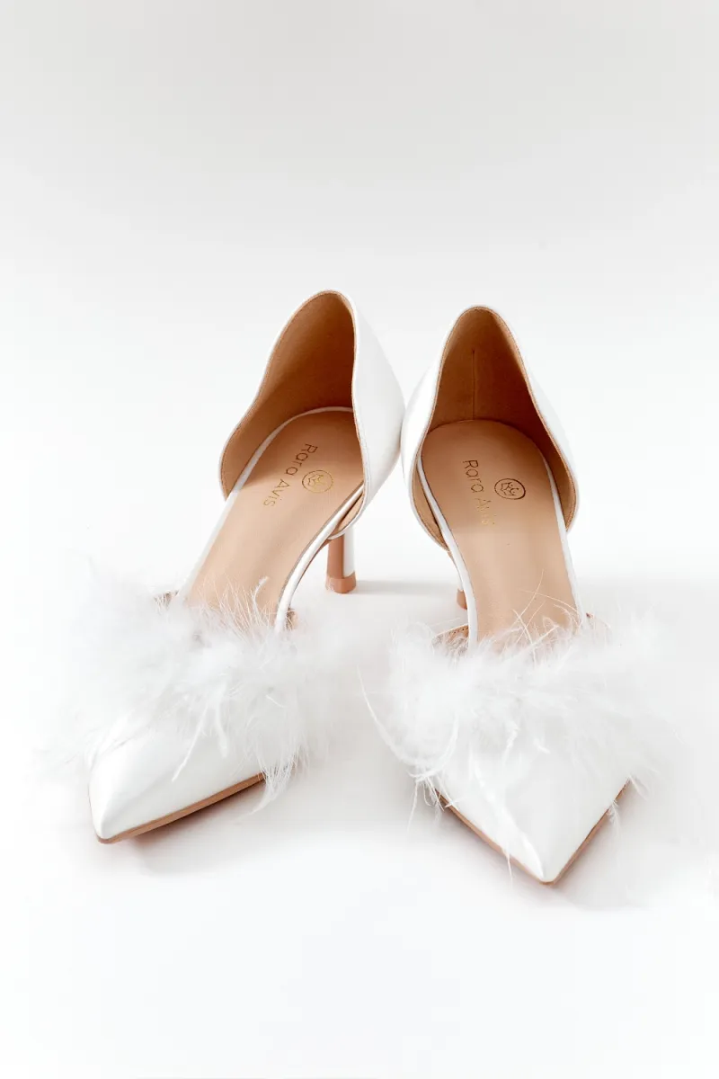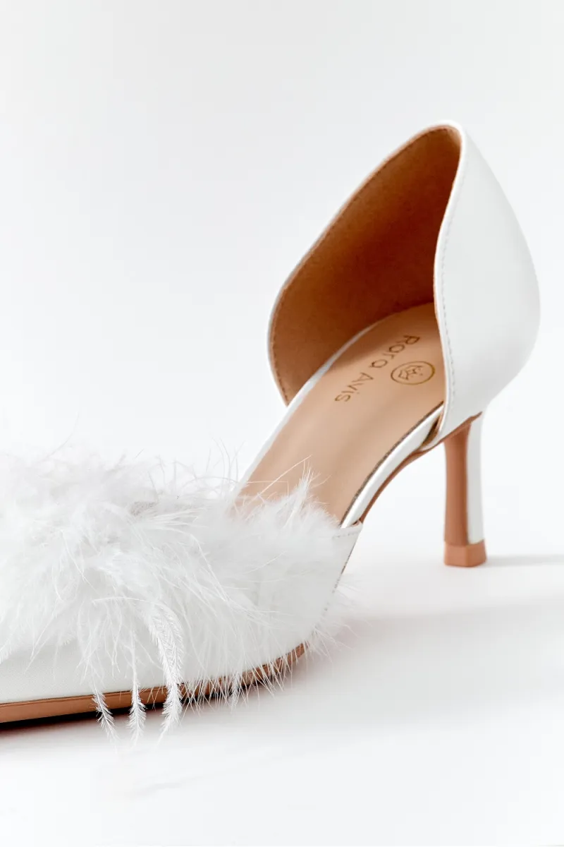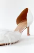 Классические лодочки с открытыми боками на невысоком каблуке. Яркий акцент данной пары – нос, дополненный перьями.