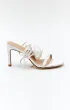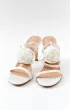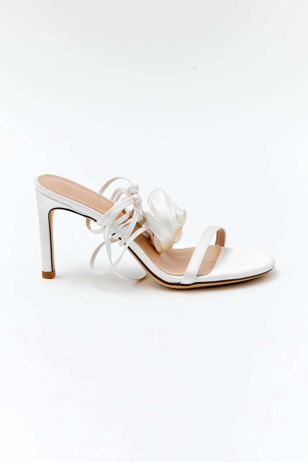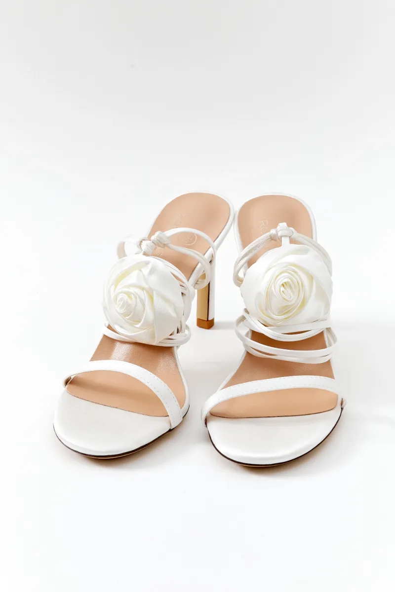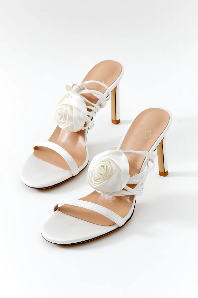 Открытые босоножки молочного цвета с завязками вокруг лодыжки. По желанию невесты тонкие ленты могут быть завязаны разным способом. Нос данной модели украшен объемной розой в сливочном цвете.