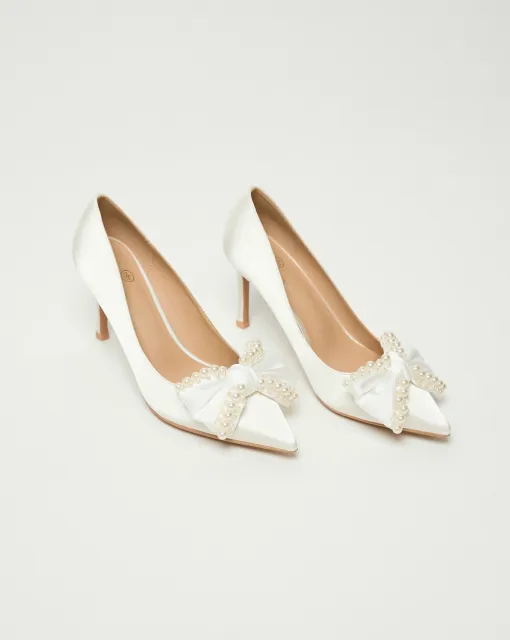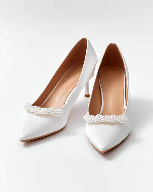 Полуоткрытые лодочки на высоком каблуке с ремешком вокруг лодыжки. Нос модели украшен объемным кружевом и декором из жемчуга, создавая утонченный образ.