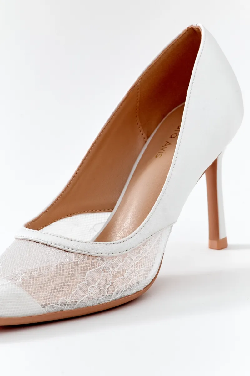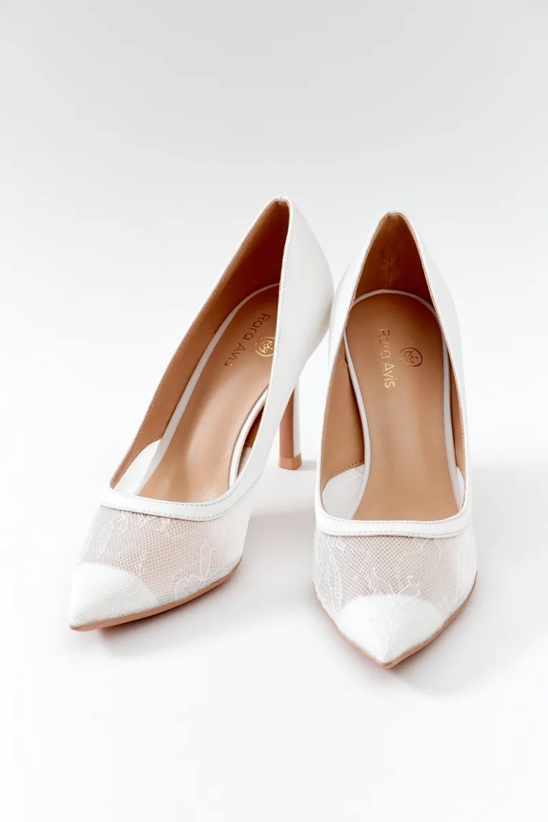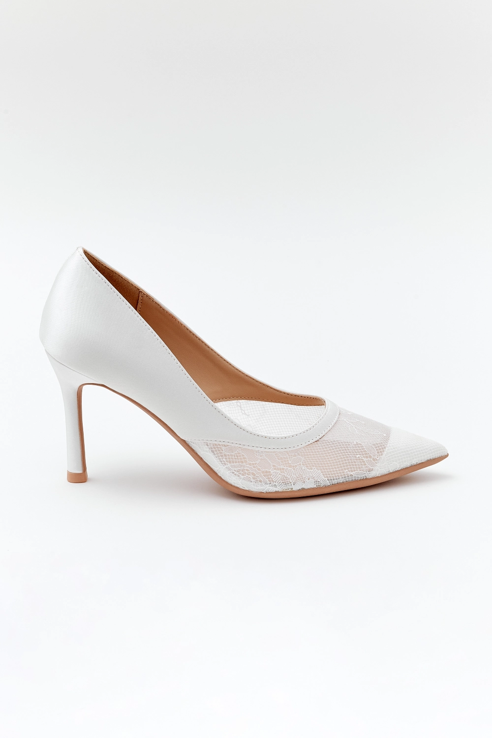 Лодочки в белом цвете. С боков до носка пара дополнена вставкой из кружева. Нос дополнен вставкой из кожи, которую накрывает кружево.