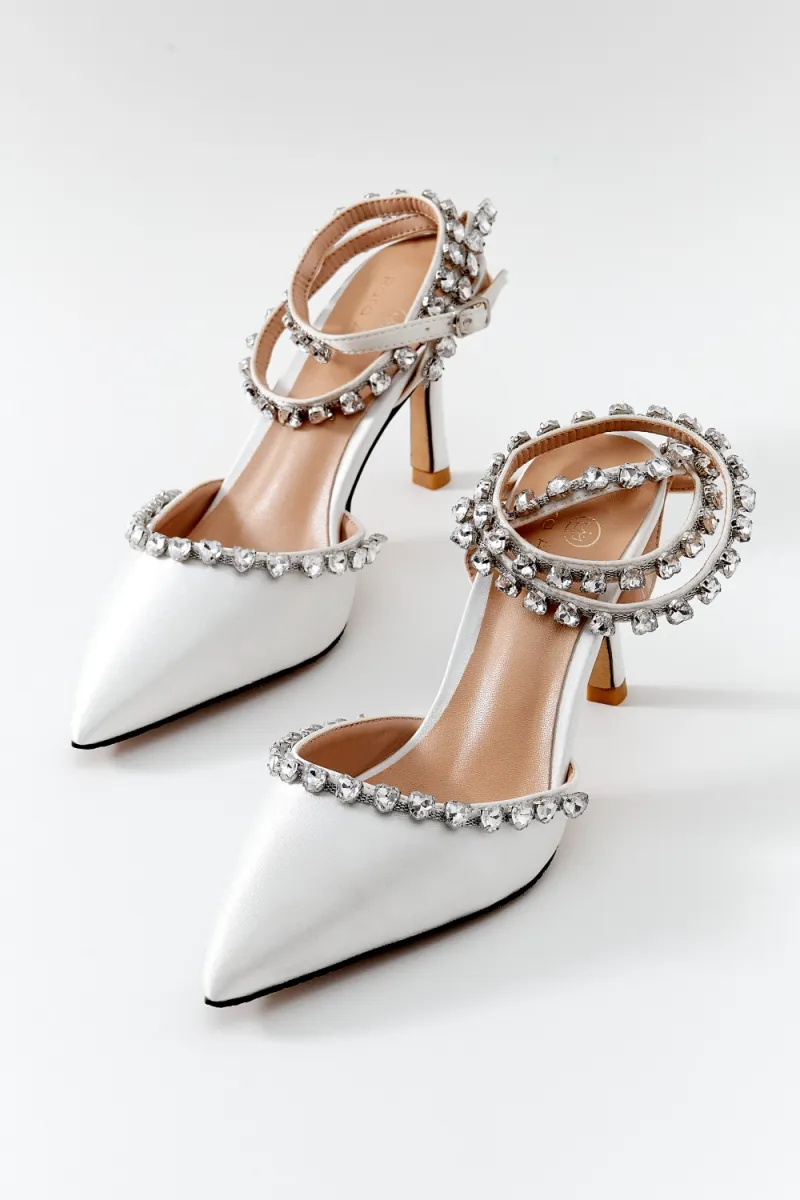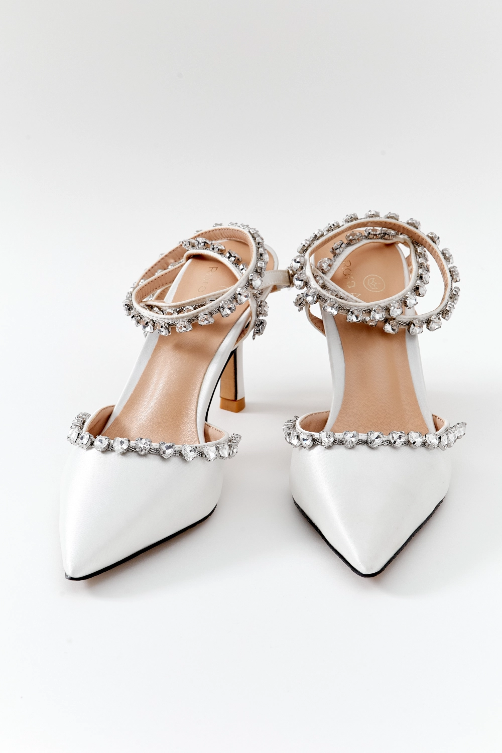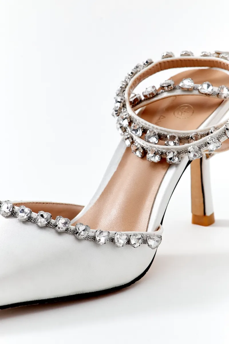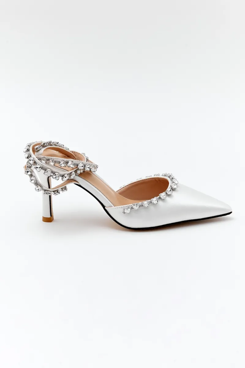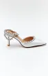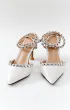 Открытые босоножки на невысоком каблуке. Модель фиксируется на ноге с помощью ремешка, который можно завязать вокруг лодыжки. В качестве декора пара дополнена крупными стразами, расположенными по краю носа и всей длине ремешка.