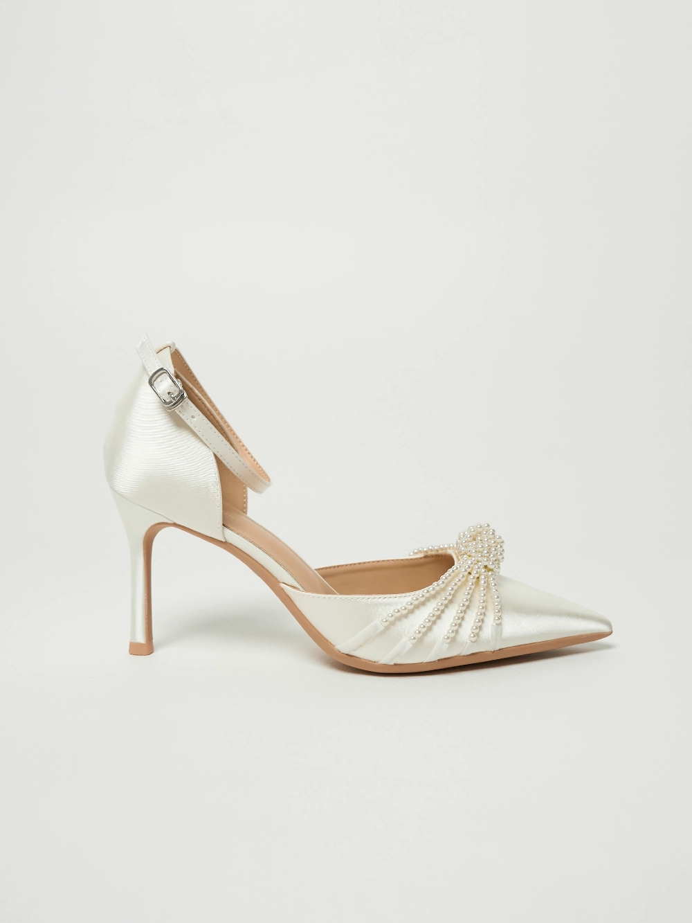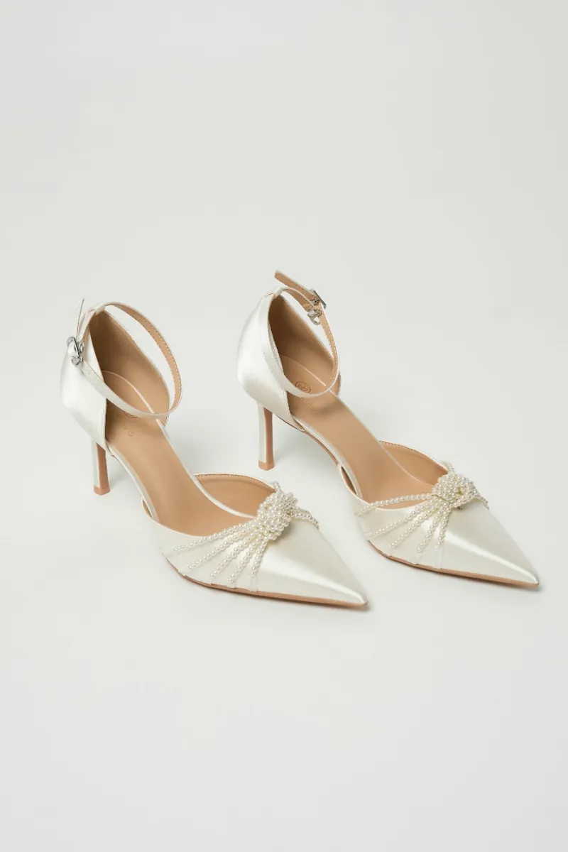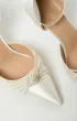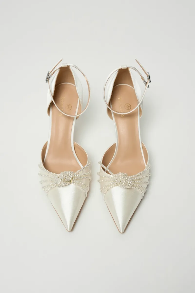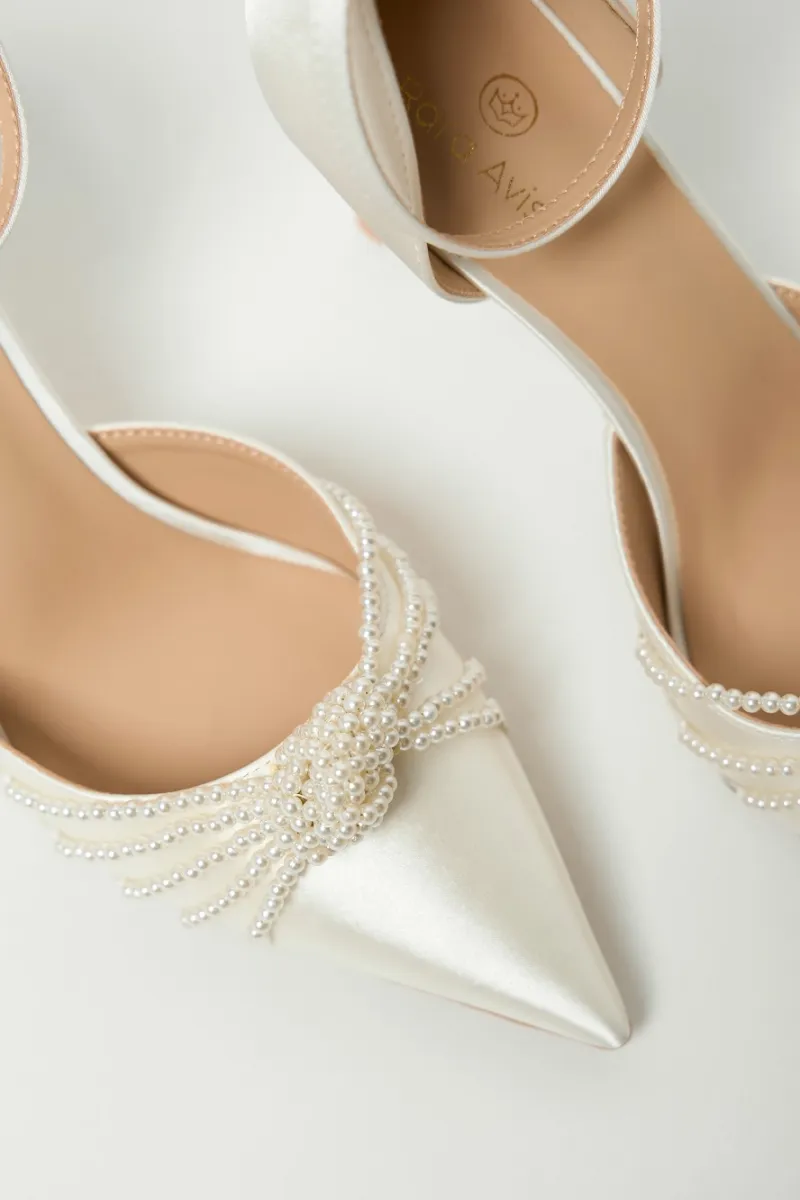 Сатиновые туфли-лодочки на шпильке, с заострённым носом и фиксацией на изящный ремешок с пряжкой . Верх украшен плетёным узлом из нитей жемчужных бусин, придающим образу мягкое сияние.