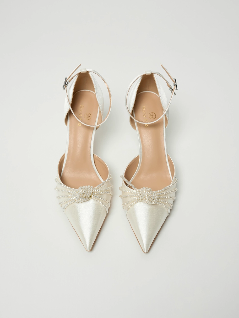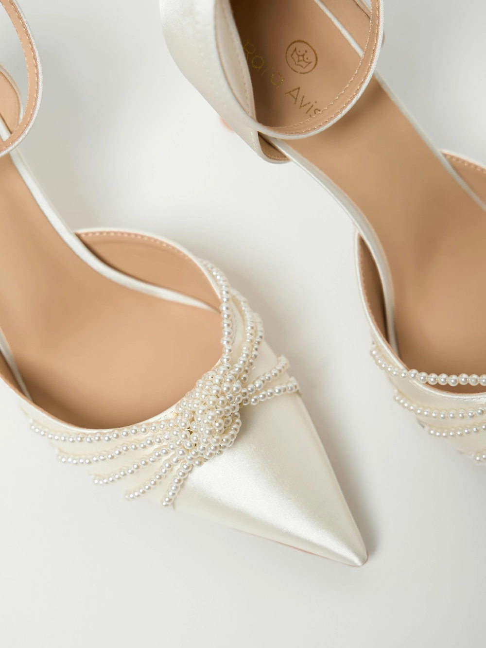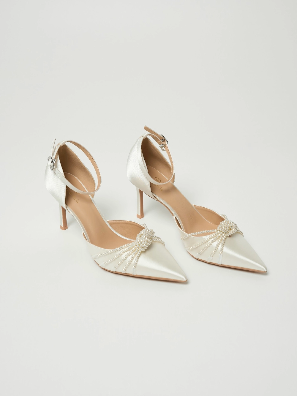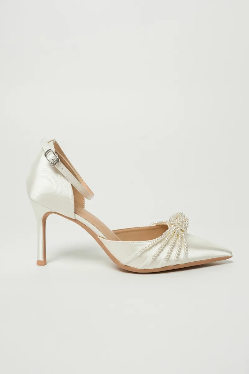 Сатиновые туфли-лодочки на шпильке, с заострённым носом и фиксацией на изящный ремешок с пряжкой . Верх украшен плетёным узлом из нитей жемчужных бусин, придающим образу мягкое сияние.