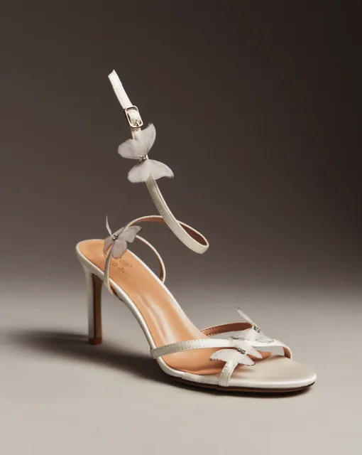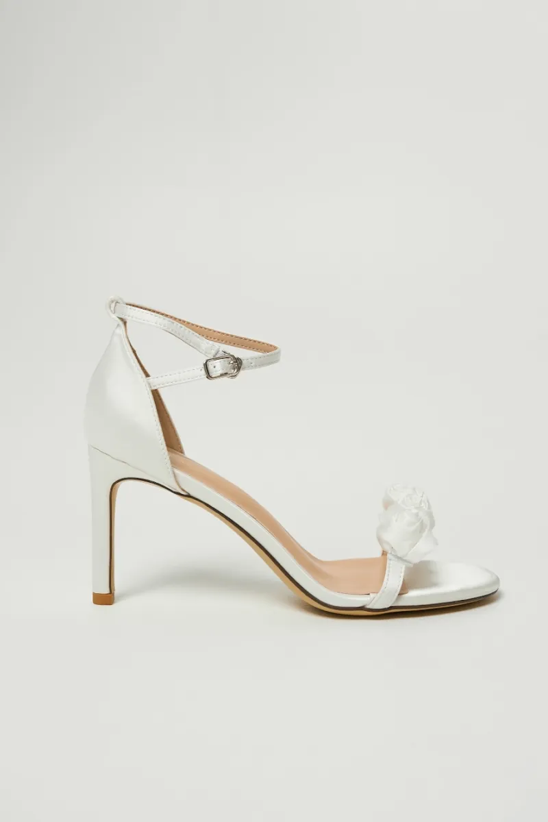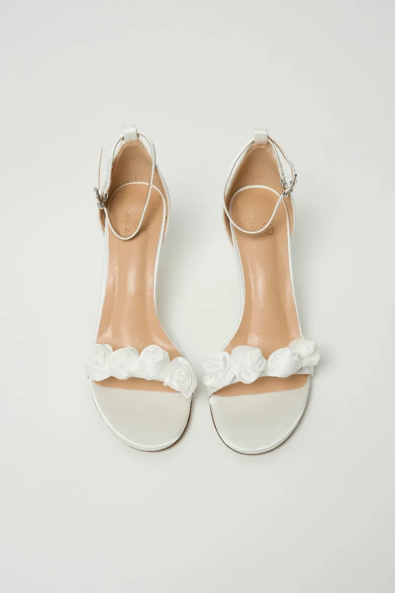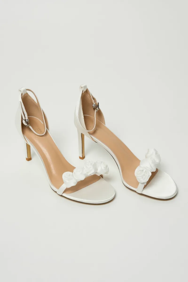 Босоножки на тонком каблуке с ремешком на щиколотке. Застёжка — металлическая пряжка. Верх из молочного сатина, украшен объёмным цветочным декором на передней перемычке.