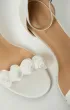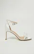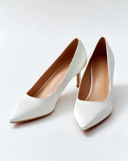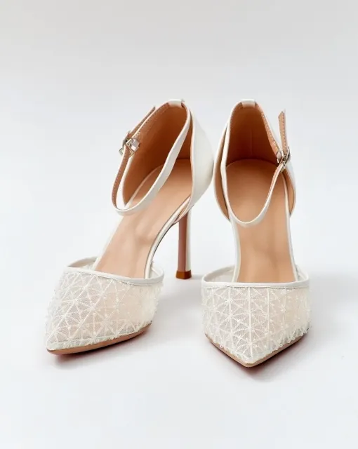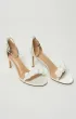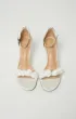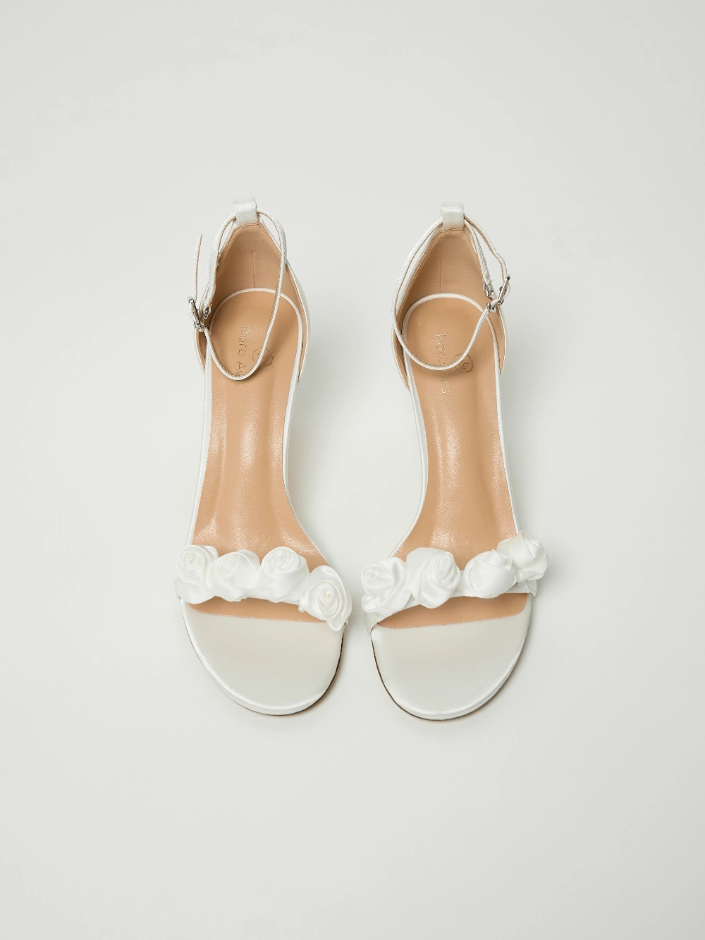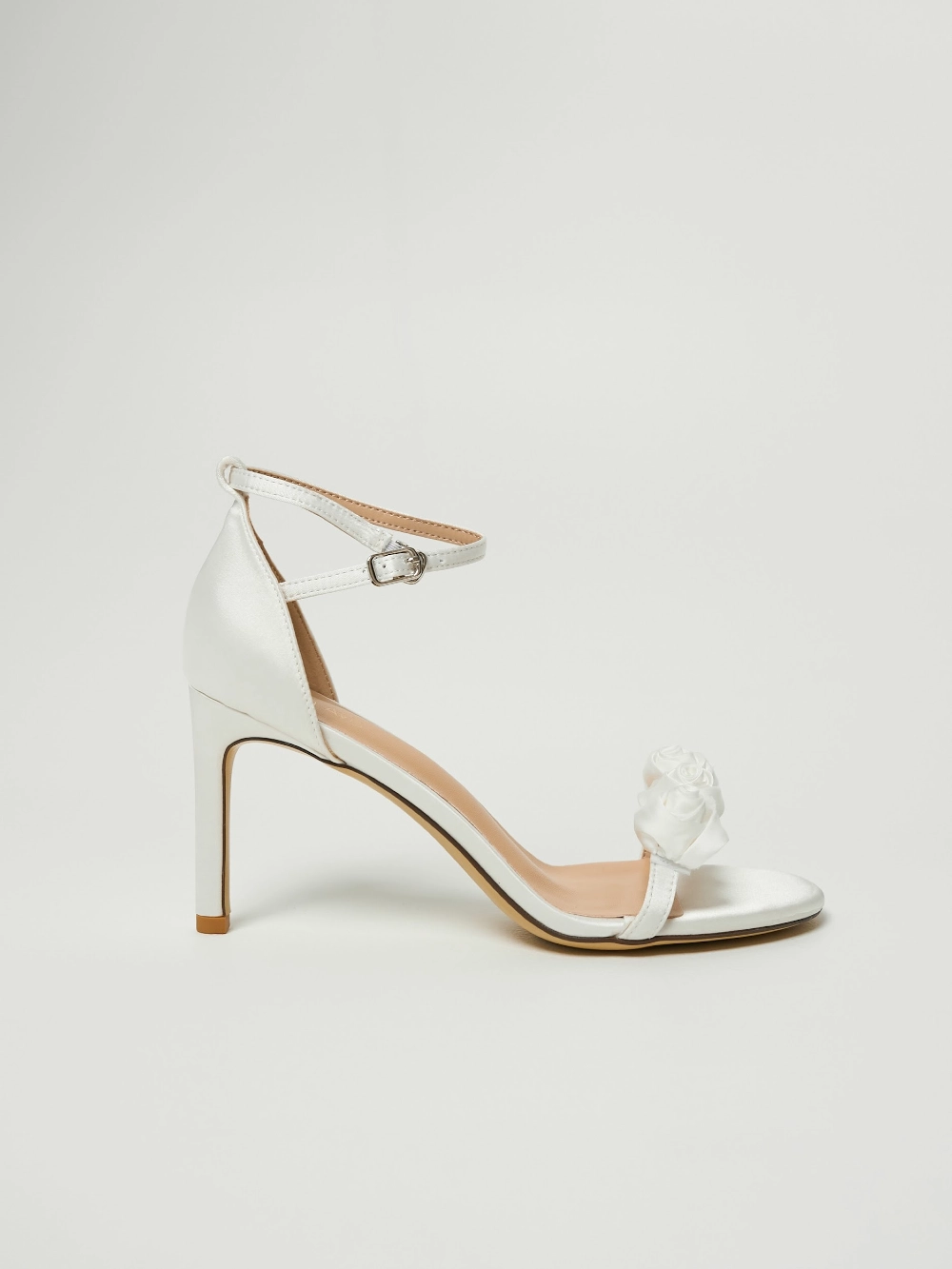 Босоножки на тонком каблуке с ремешком на щиколотке. Застёжка — металлическая пряжка. Верх из молочного сатина, украшен объёмным цветочным декором на передней перемычке.