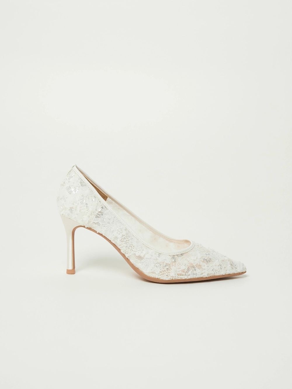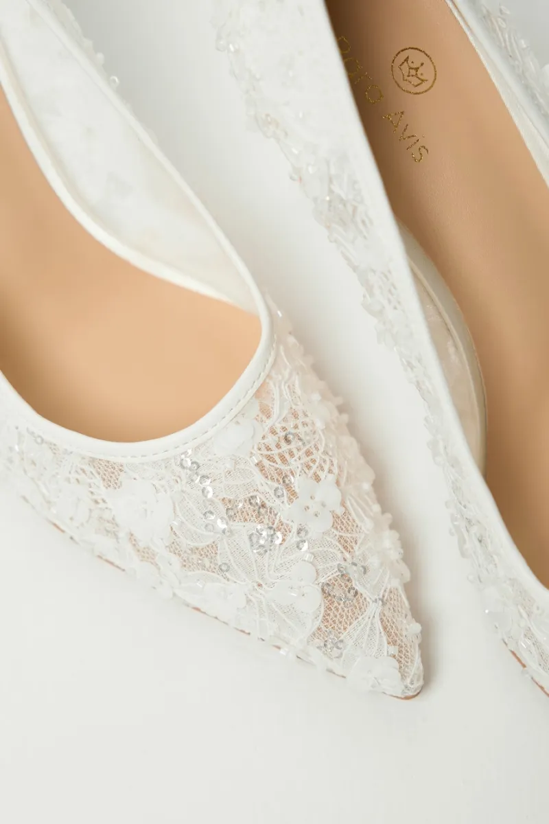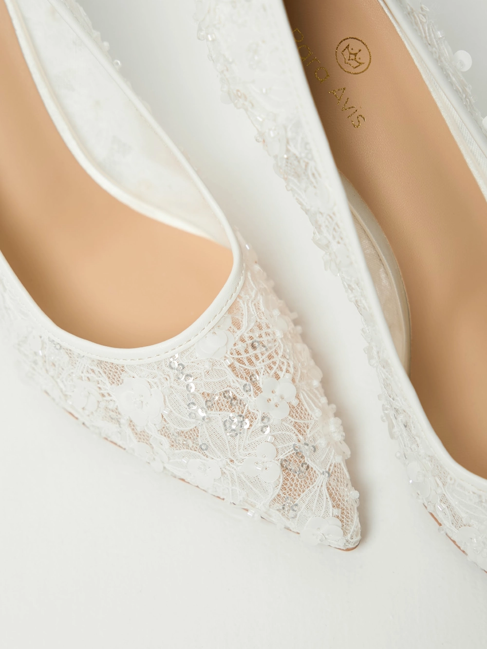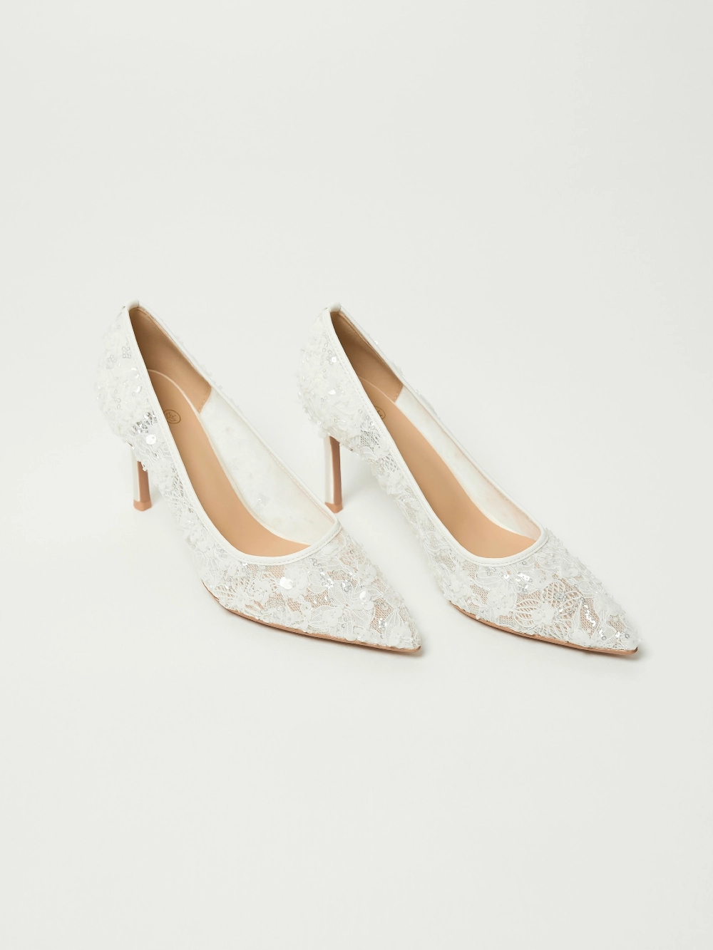 Туфли-лодочки на шпильке, с закрытой пяткой и острым носом. Верх покрыт тонким кружевом с вышивкой, бисером и пайетками, создающими деликатное мерцание.