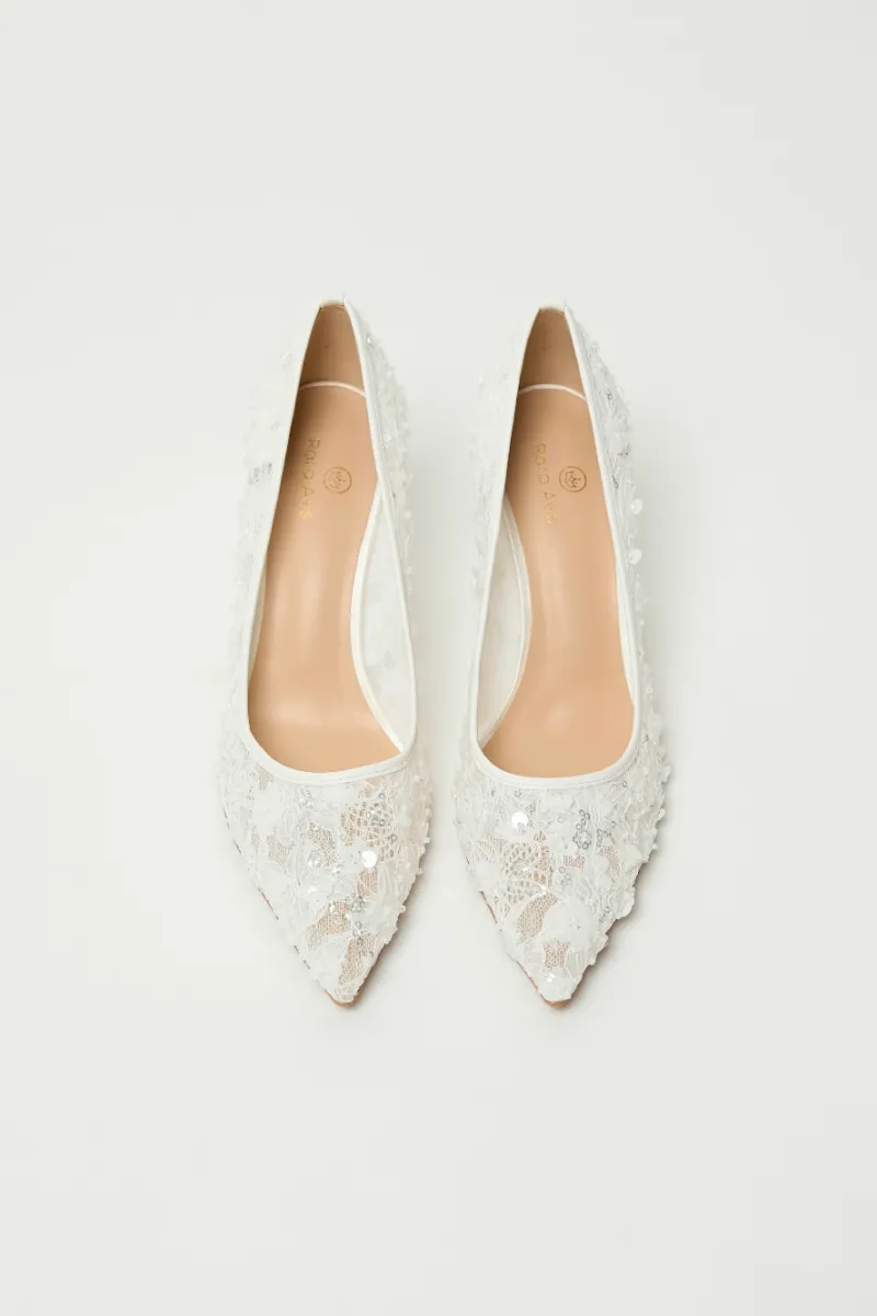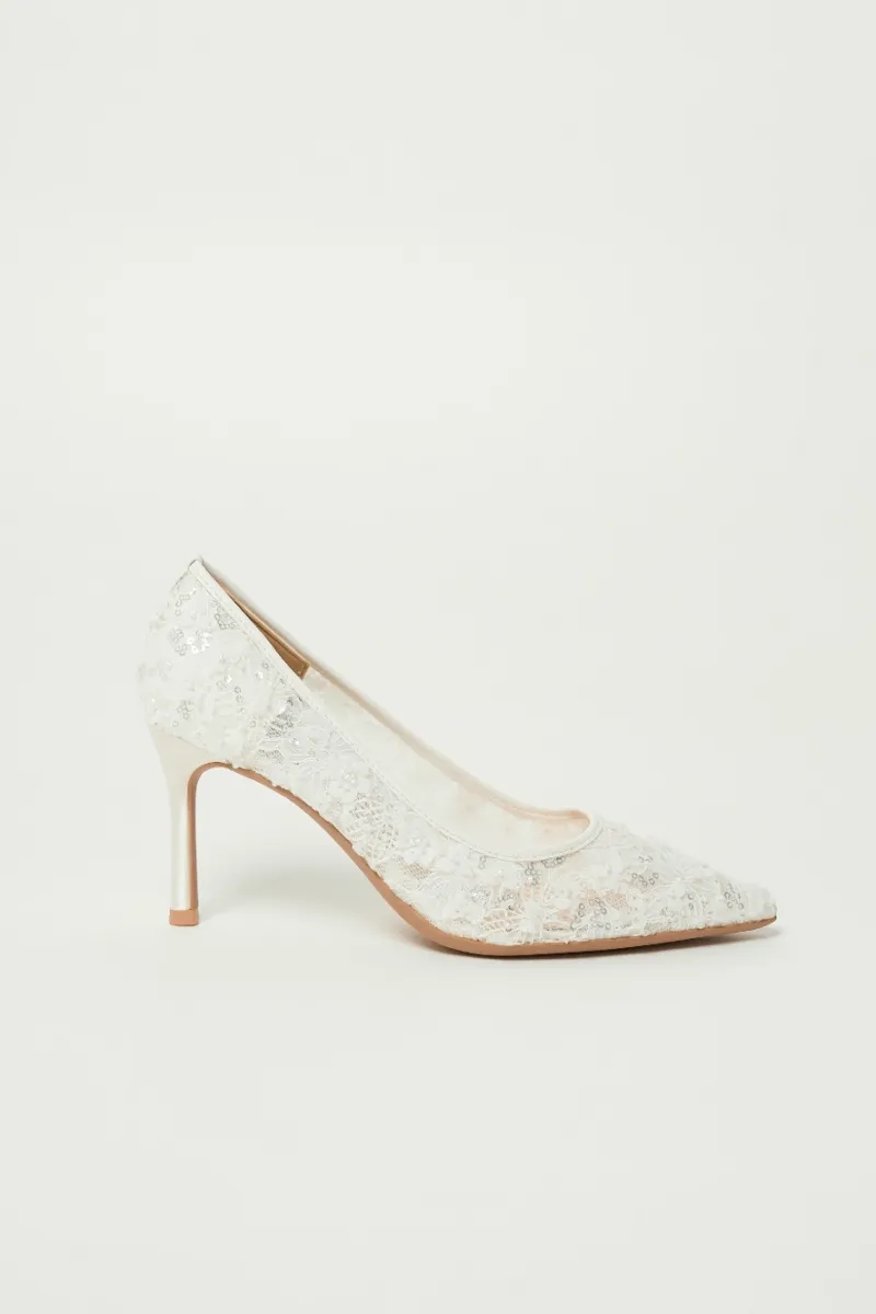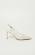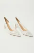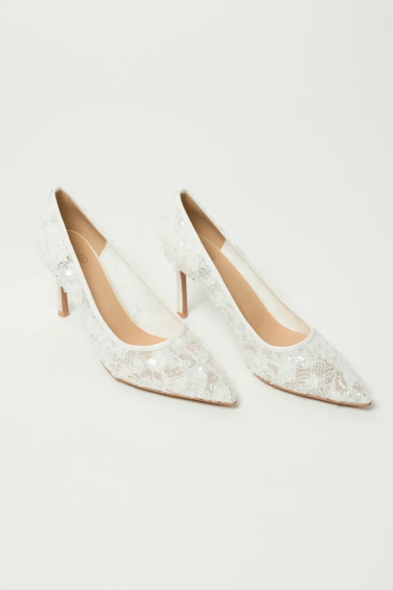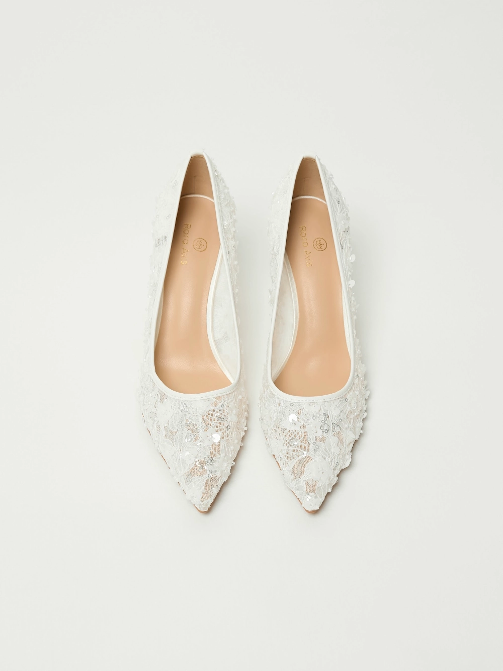 Туфли-лодочки на шпильке, с закрытой пяткой и острым носом. Верх покрыт тонким кружевом с вышивкой, бисером и пайетками, создающими деликатное мерцание.