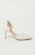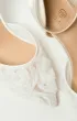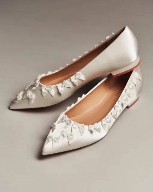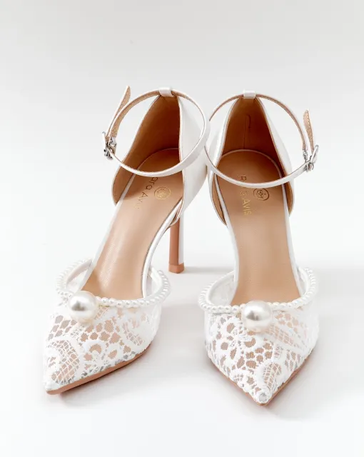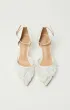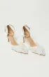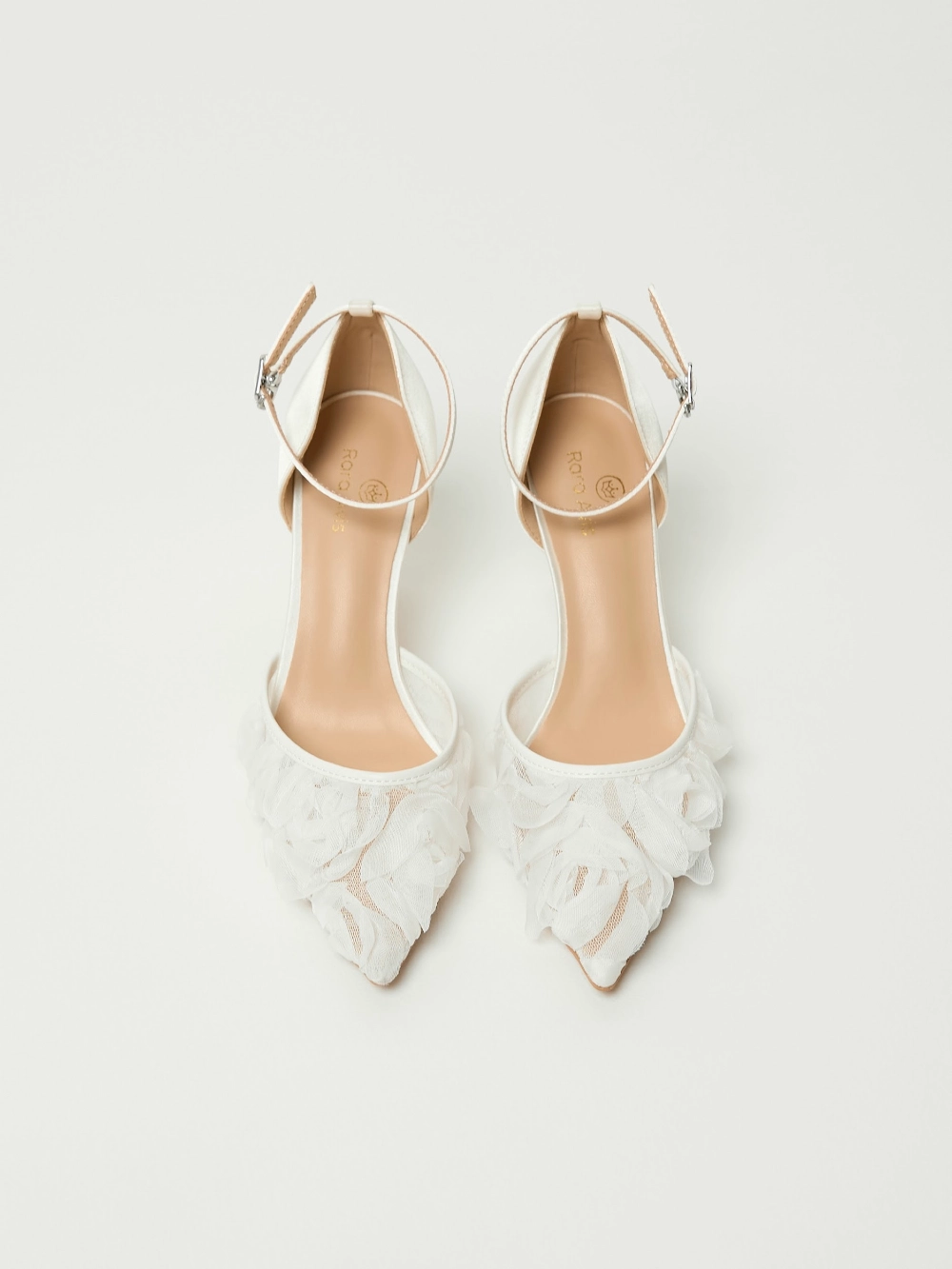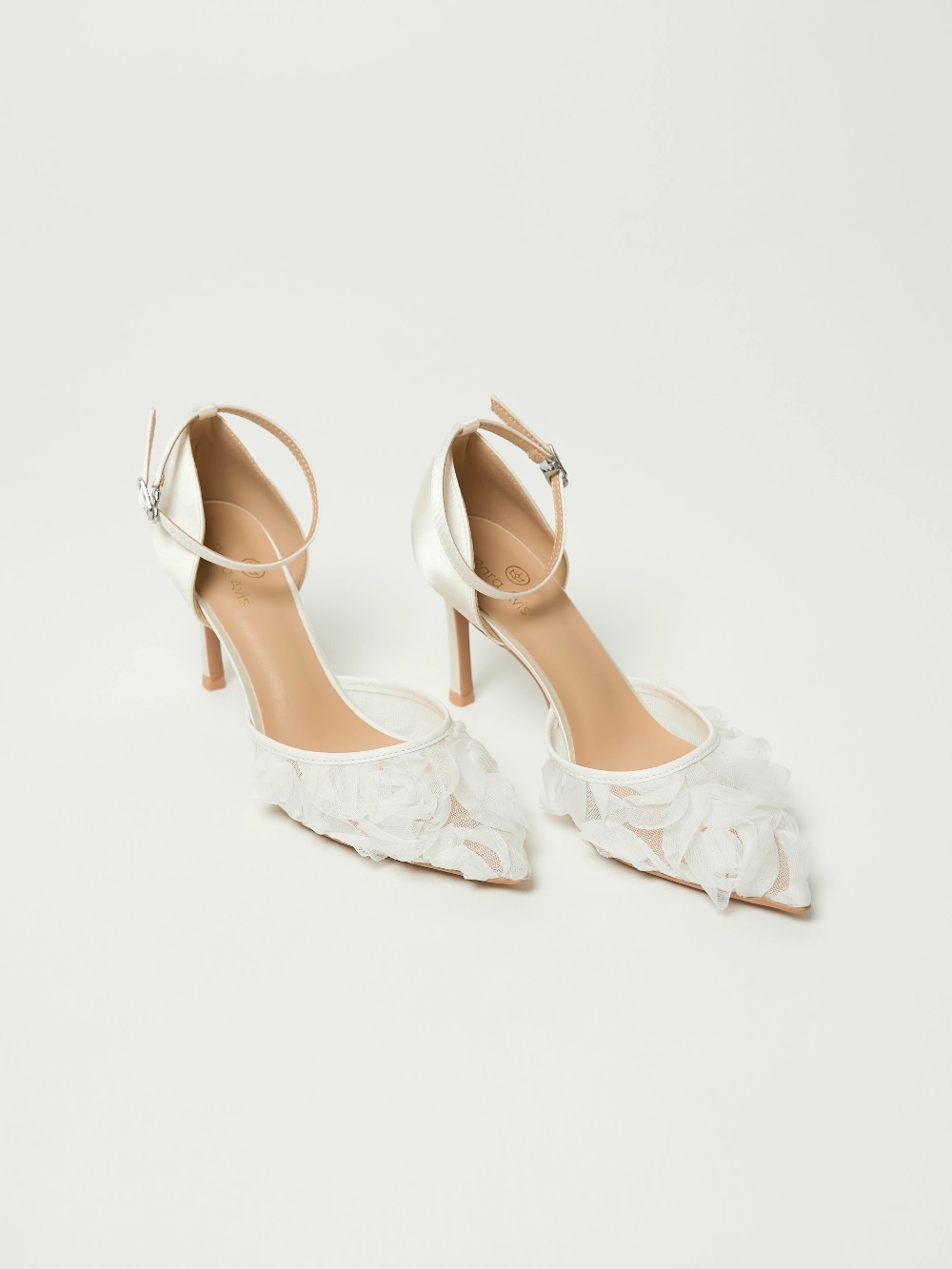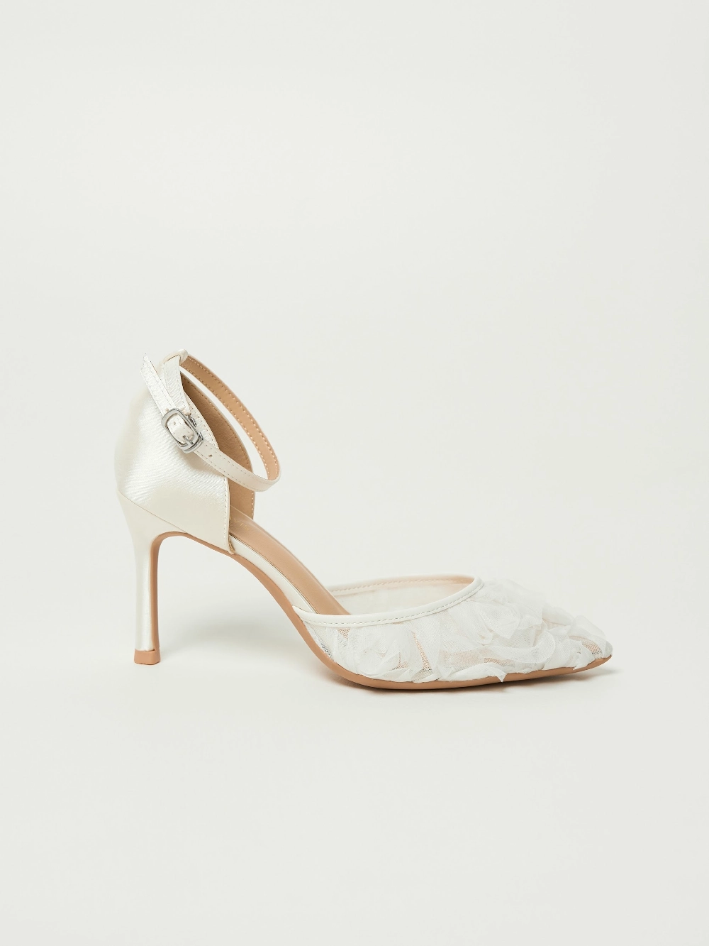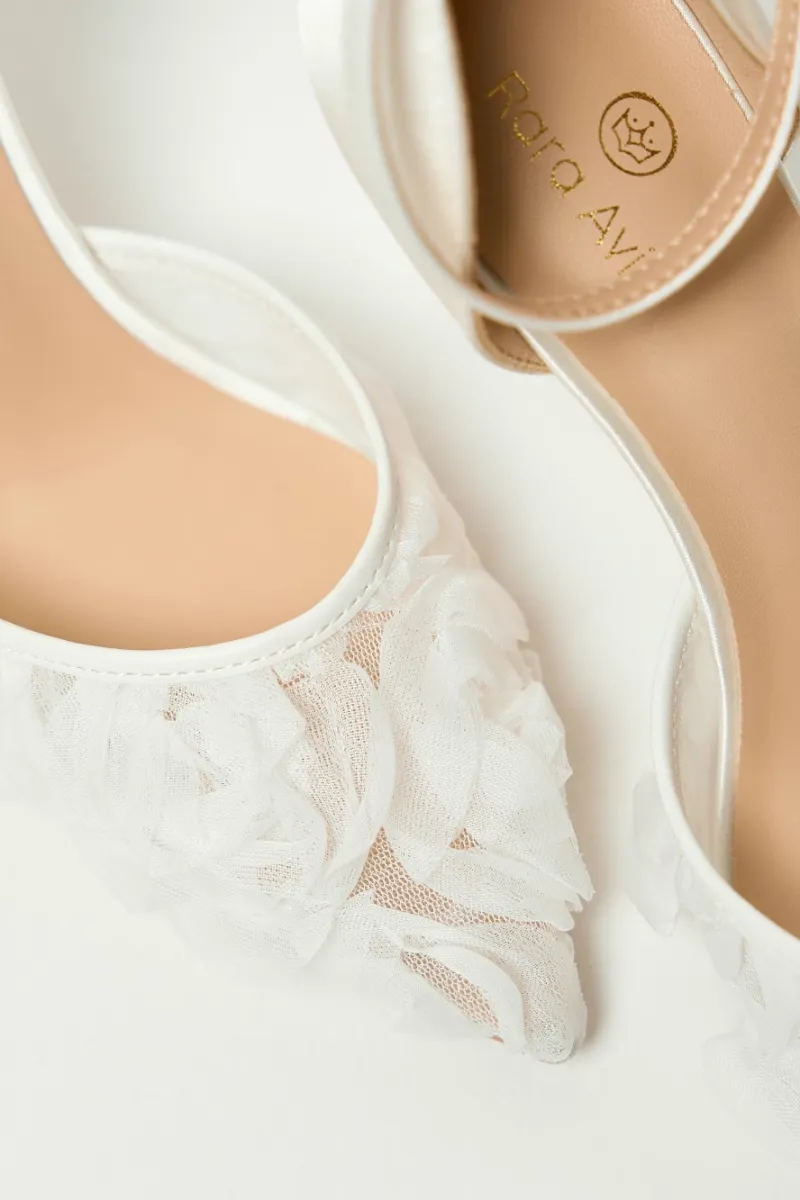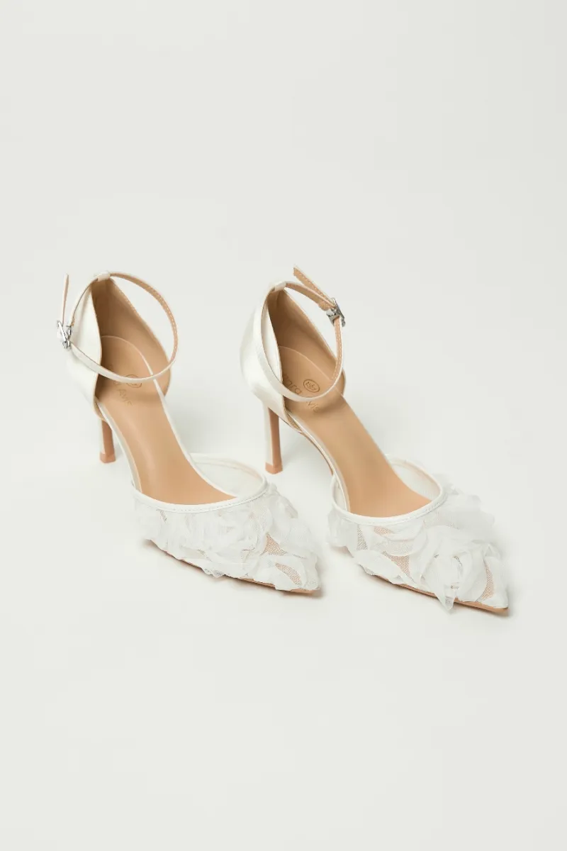 Туфли-лодочки на шпильке, с открытой пяткой и острым носом. Основа выполнена из прозрачной сетки, создающей лёгкий и воздушный силуэт. Верх украшен объёмными цветами из нежного молочного шифона. Фиксация сзади — с помощью ремешка с пряжкой.