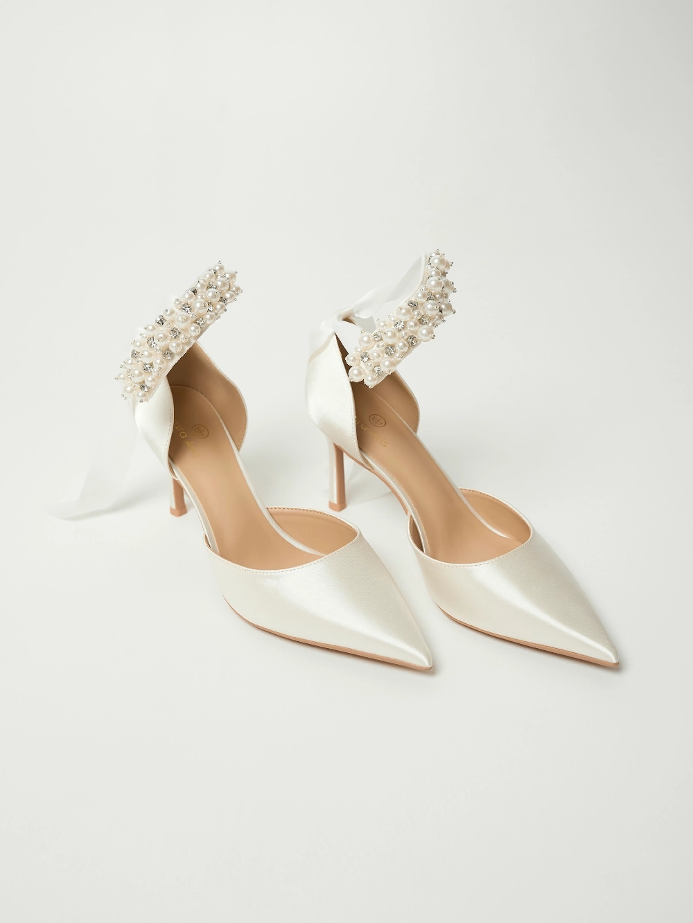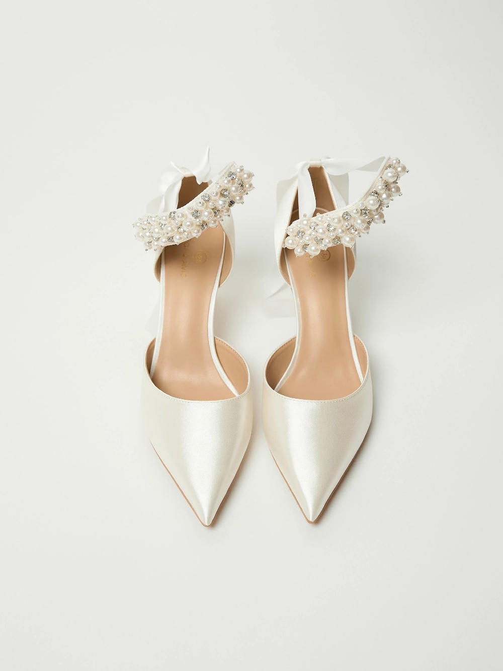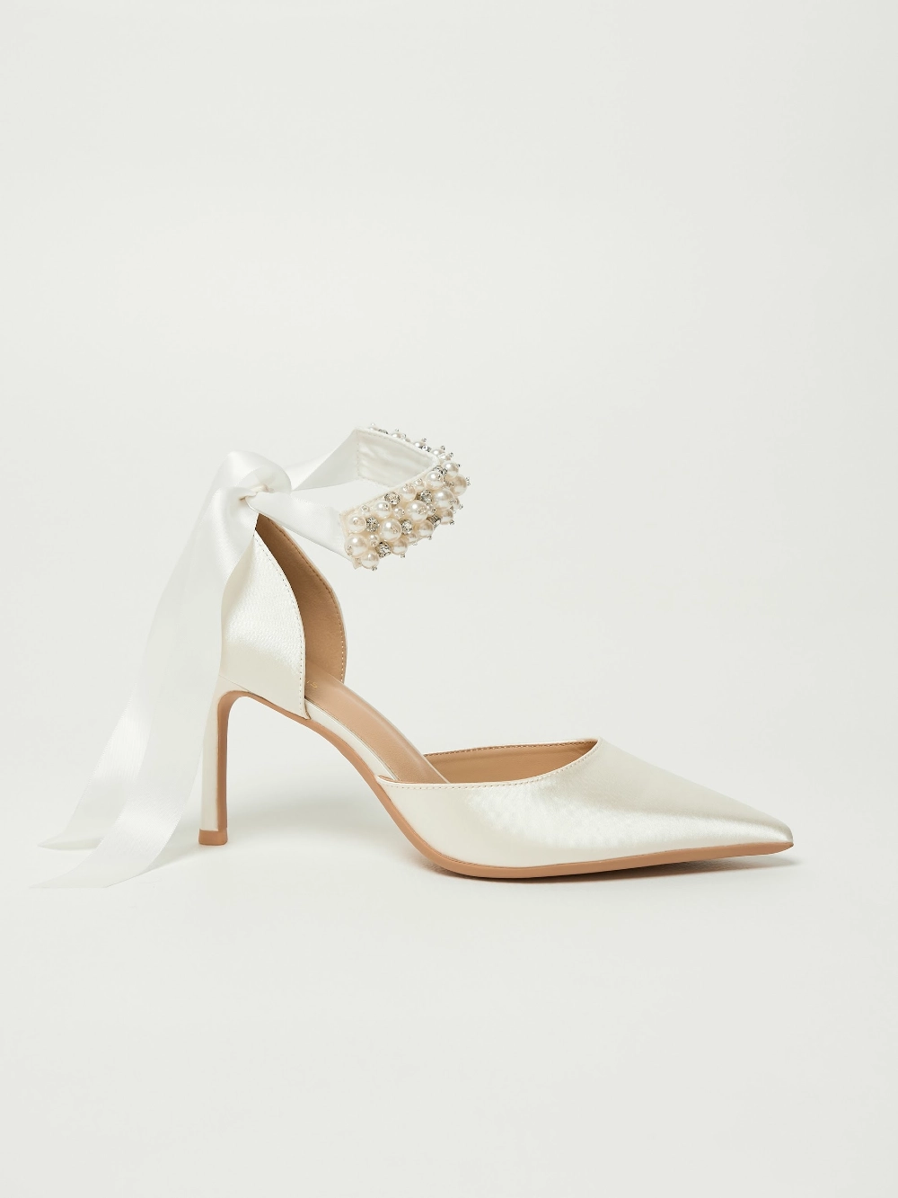 Туфли-лодочки из белоснежного сатина, на шпильке, с острым носом и закрытой пяткой. Изюминка модели — тонкие ремешки вокруг щиколотки, украшенные жемчужинами, бисером и кристаллами, с атласными лентами для завязки.