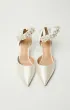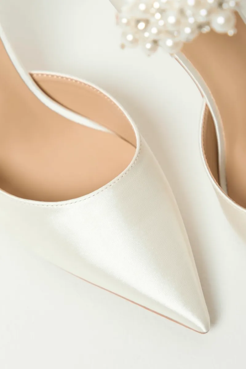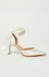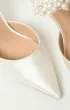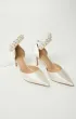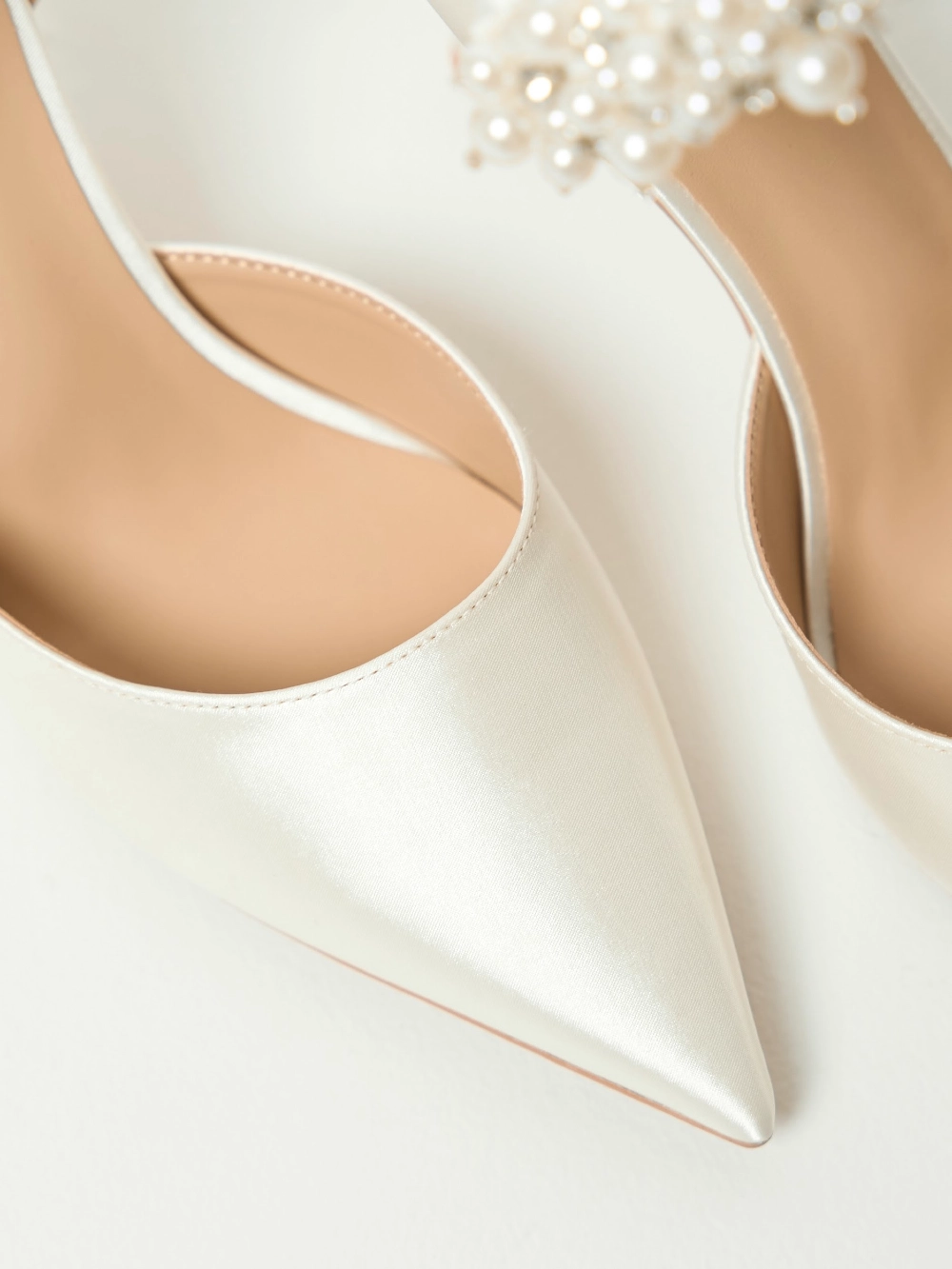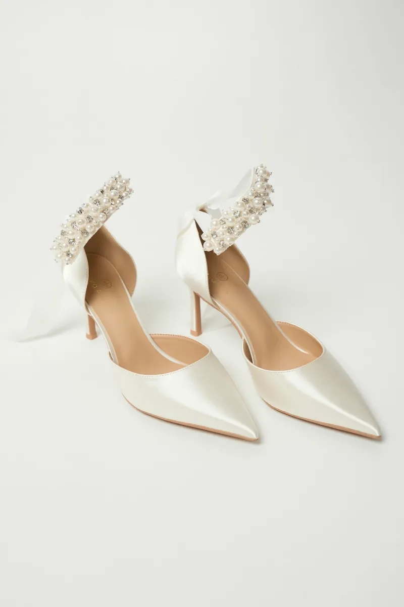 Туфли-лодочки из белоснежного сатина, на шпильке, с острым носом и закрытой пяткой. Изюминка модели — тонкие ремешки вокруг щиколотки, украшенные жемчужинами, бисером и кристаллами, с атласными лентами для завязки.