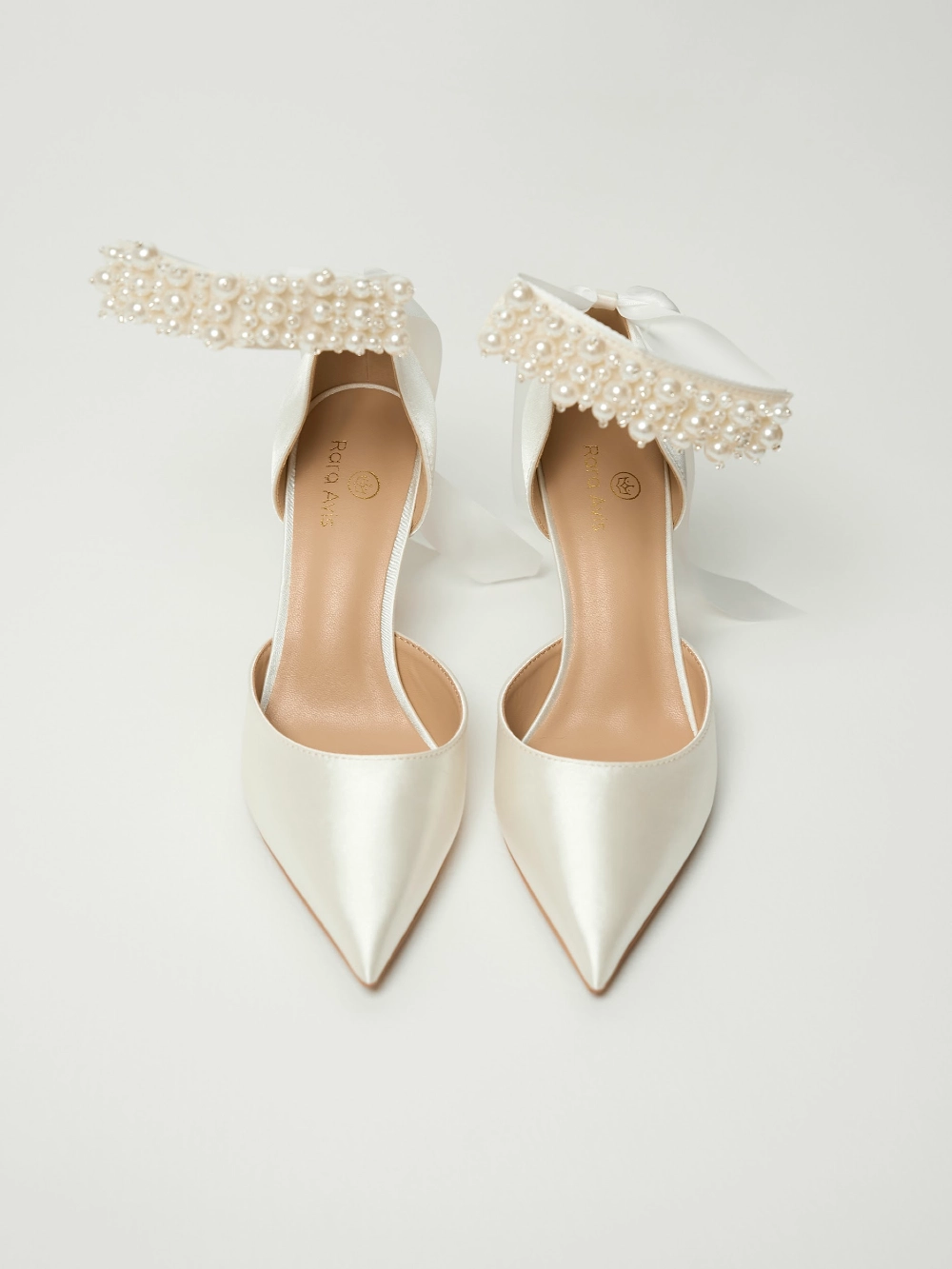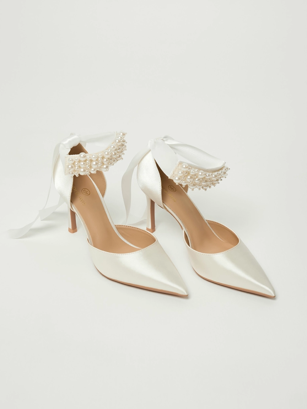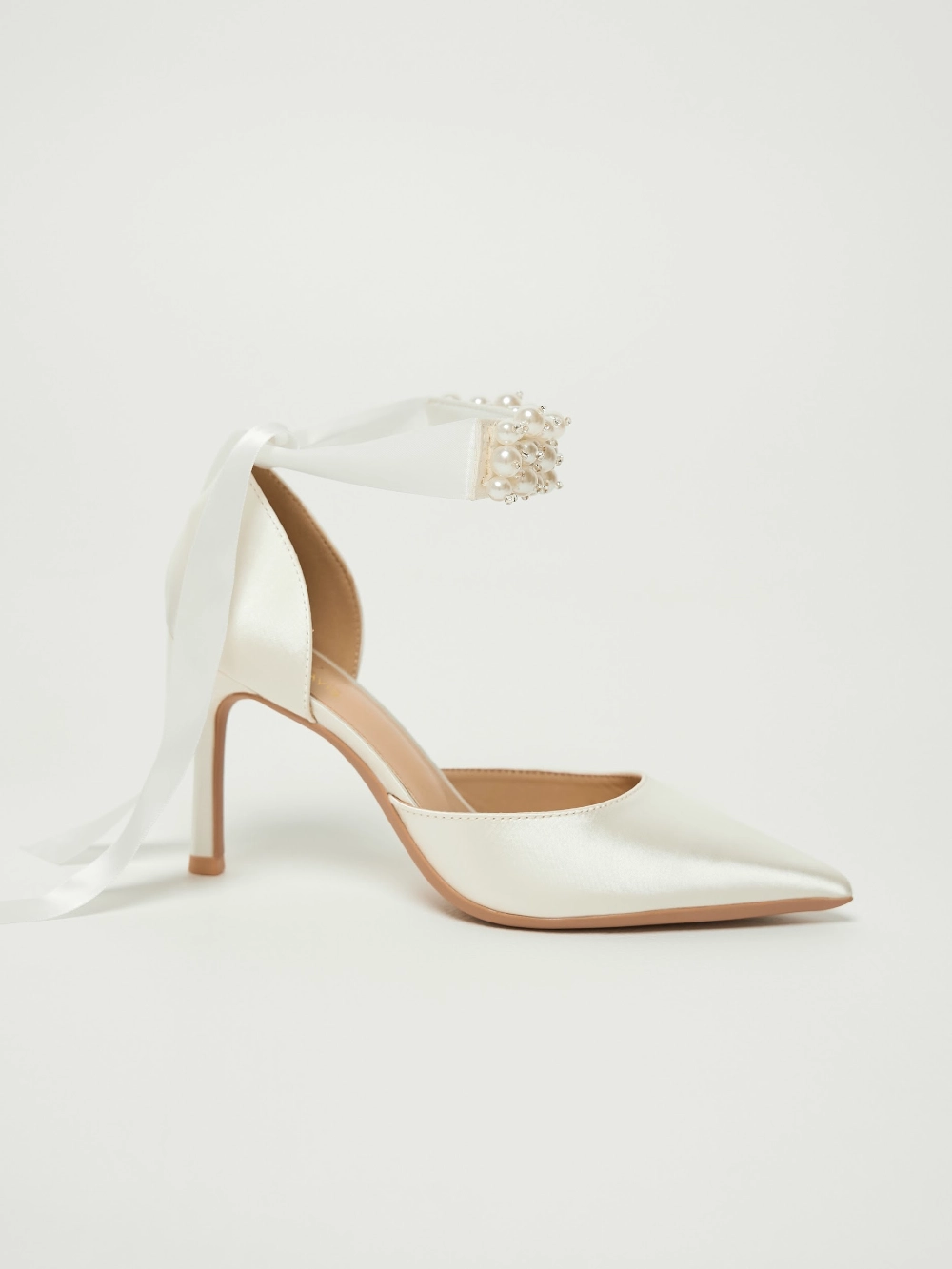 Туфли-лодочки из белоснежного сатина, на шпильке, с острым носом и закрытой пяткой. Изюминка модели — тонкие ремешки вокруг щиколотки, украшенные жемчужинами и бисером , с атласными лентами для завязки.